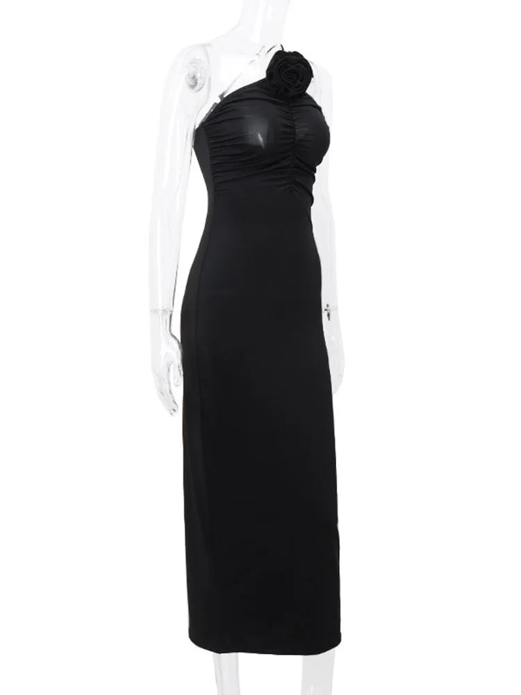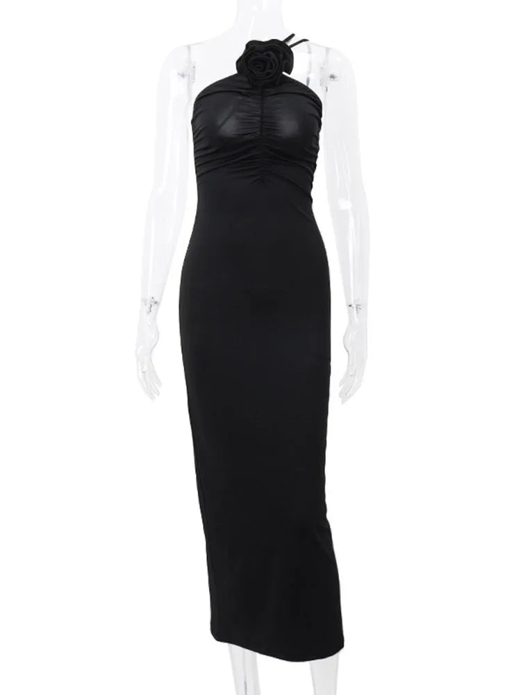 Flower Bodycon Maxi Dresses For Women Folds Slim Black Sundress Women's Sexy Backless Party Temperament Dresses Woman