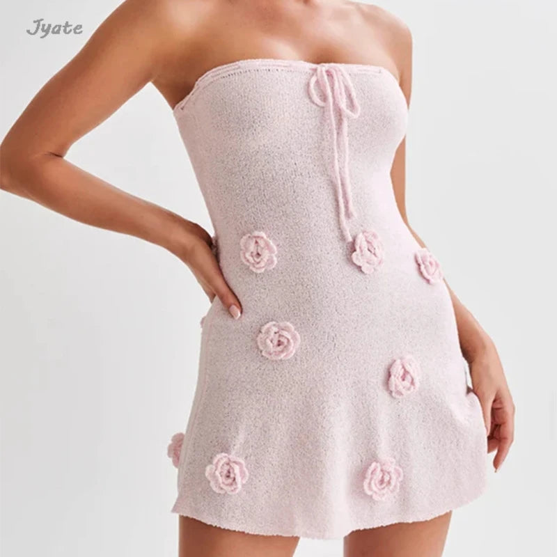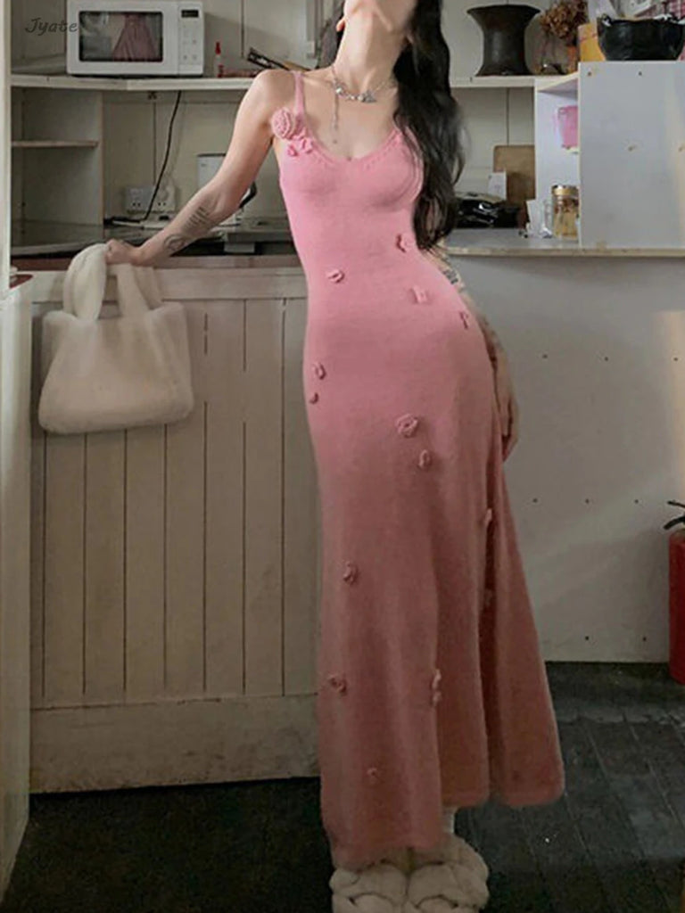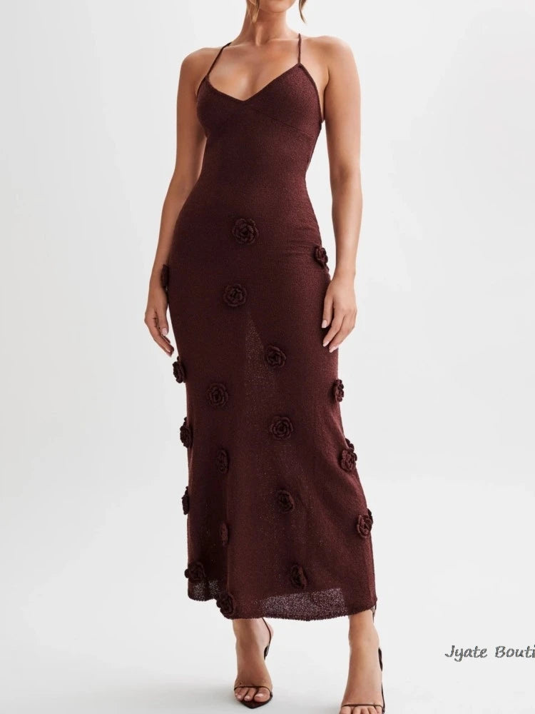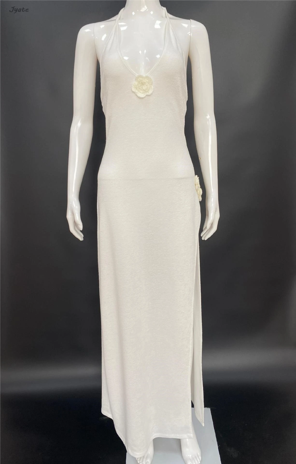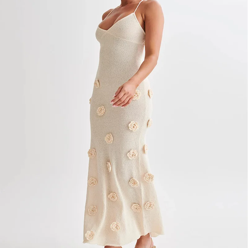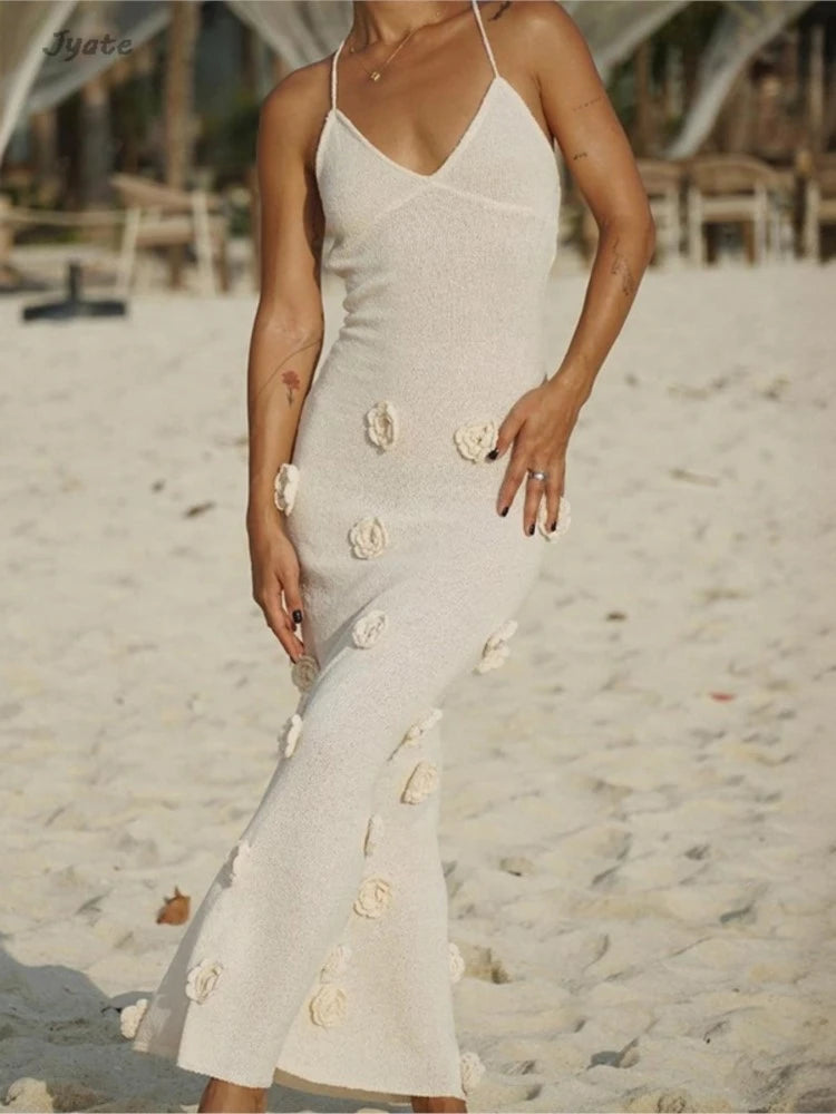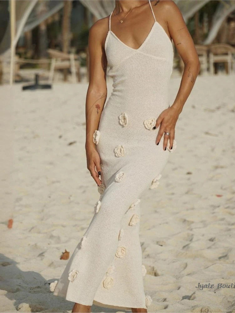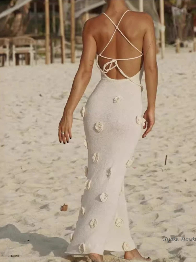 Three-dimensional Flower Knitt Backless Lace Up Vestidos Fashion V-neck Vacation Beach Long Dress Sexy Slim Party Dress 2024 New