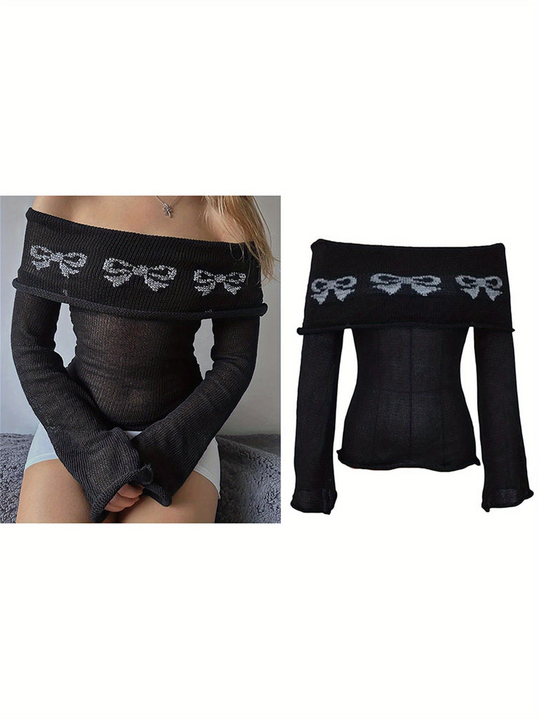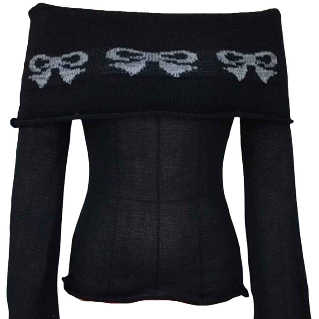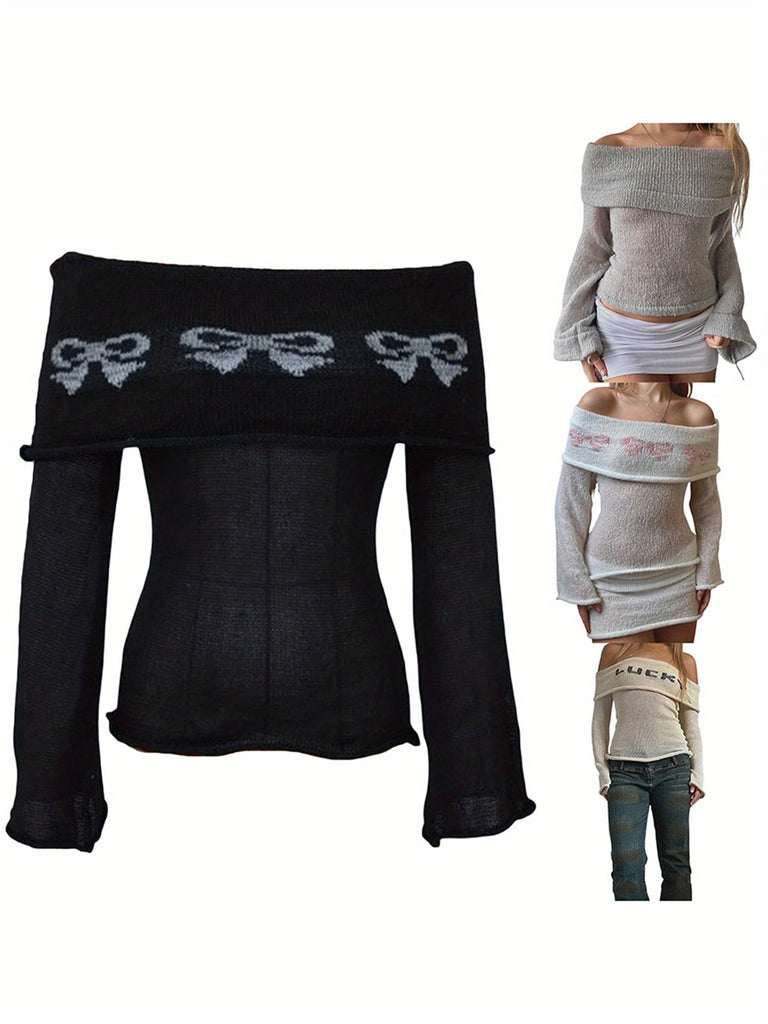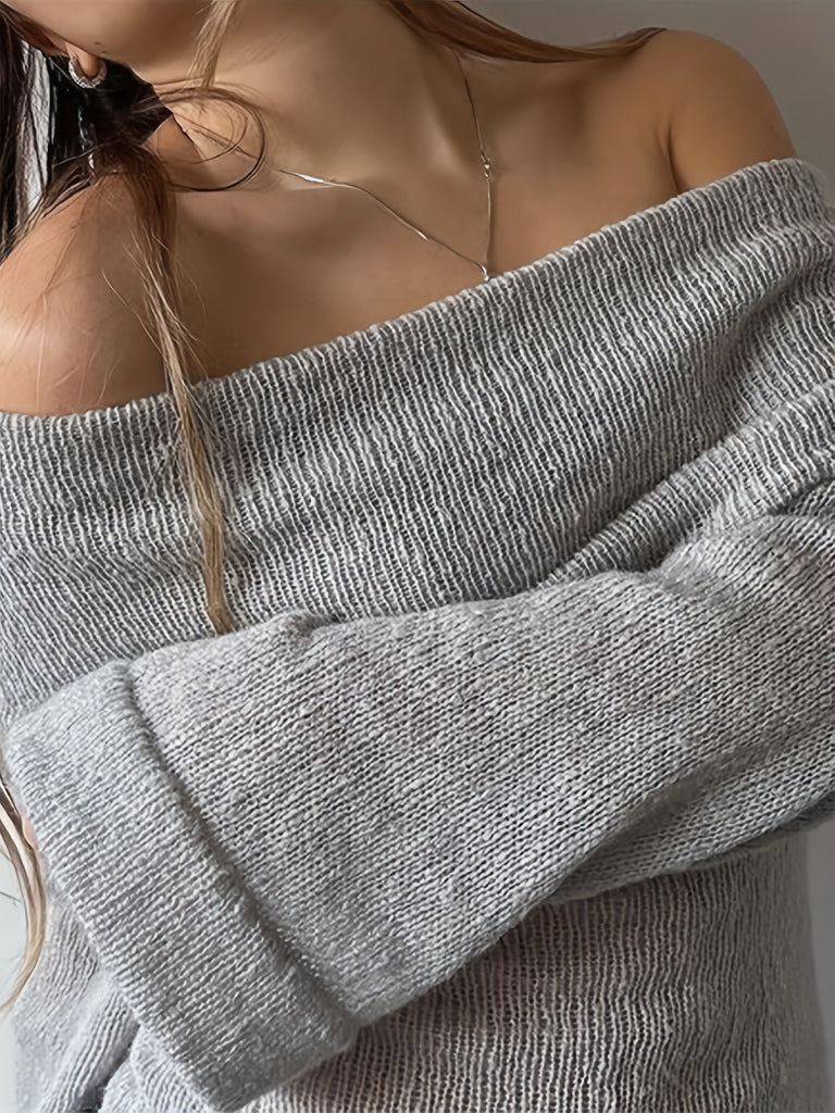 Unique Grey Off-Shoulder Sweater - Chic Boat Neck Long Slim-Fit Knit Top with Bow Detail, Machine Washable, Casual Style for Spring/Fall, Classic Leisure Sweater for Ladies