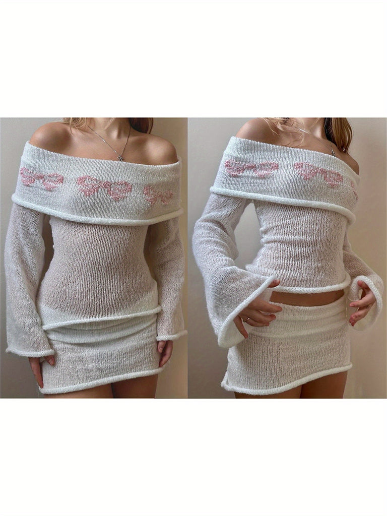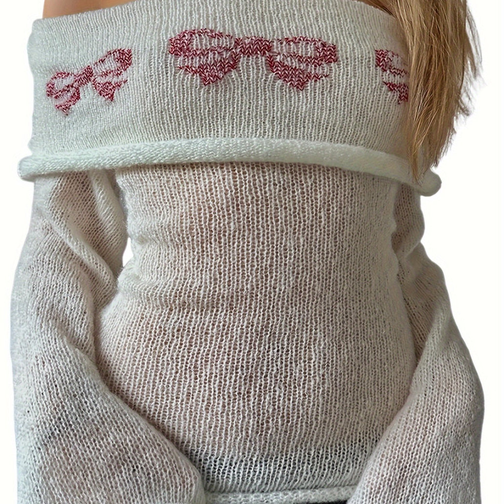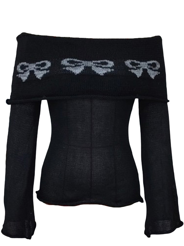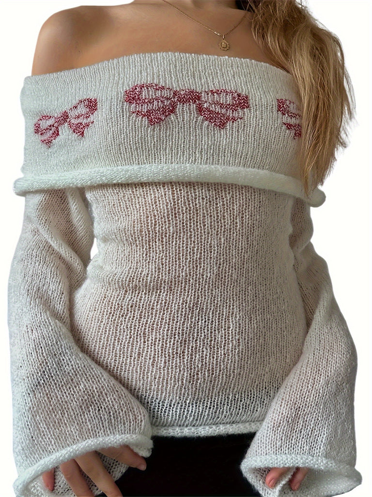 Unique Grey Off-Shoulder Sweater - Chic Boat Neck Long Slim-Fit Knit Top with Bow Detail, Machine Washable, Casual Style for Spring/Fall, Classic Leisure Sweater for Ladies