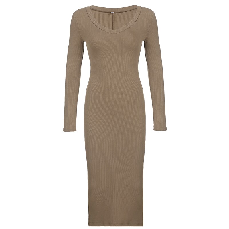 Khaki V-Neck Long-Sleeve Split Maxi Dress