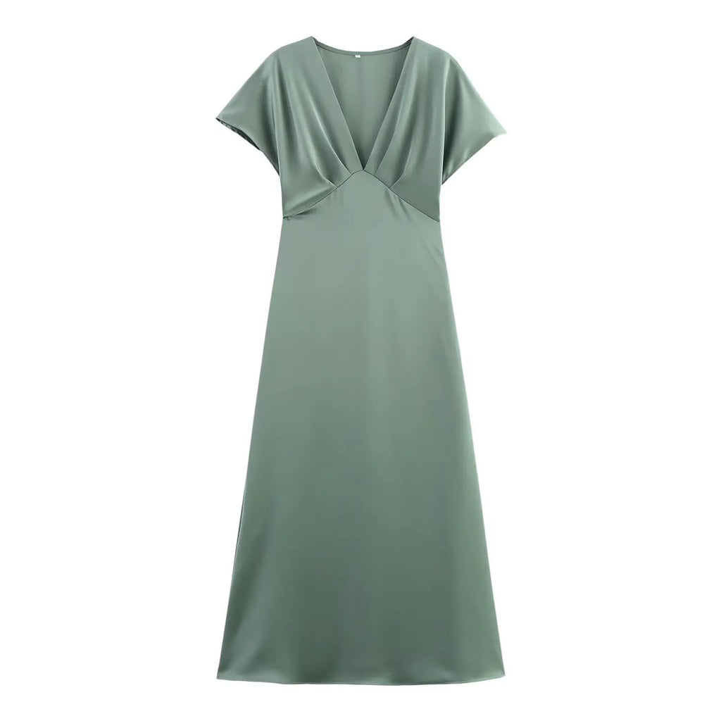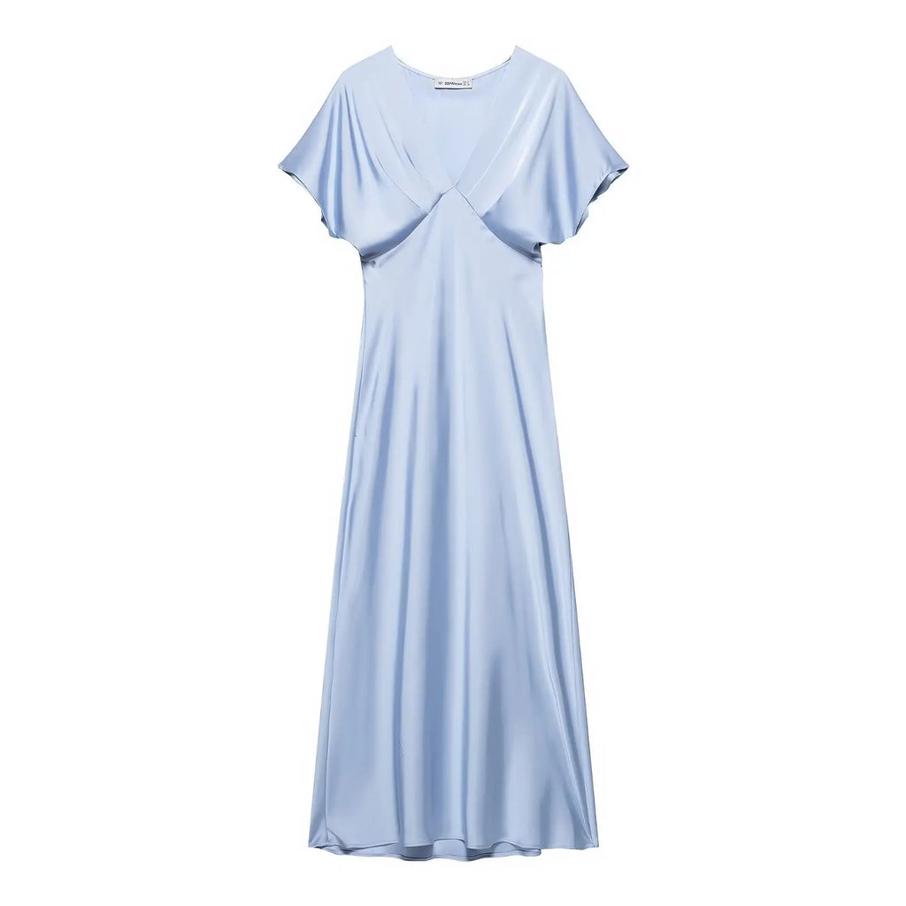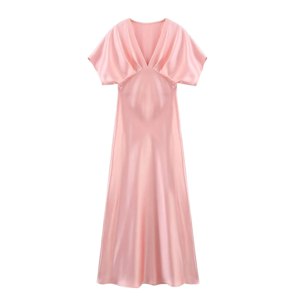 V-neck Flare Sleeve Party Dress Simple All-match Solid Color Satin Long Dress New High Waist Fashion Chic Femme Vestidos