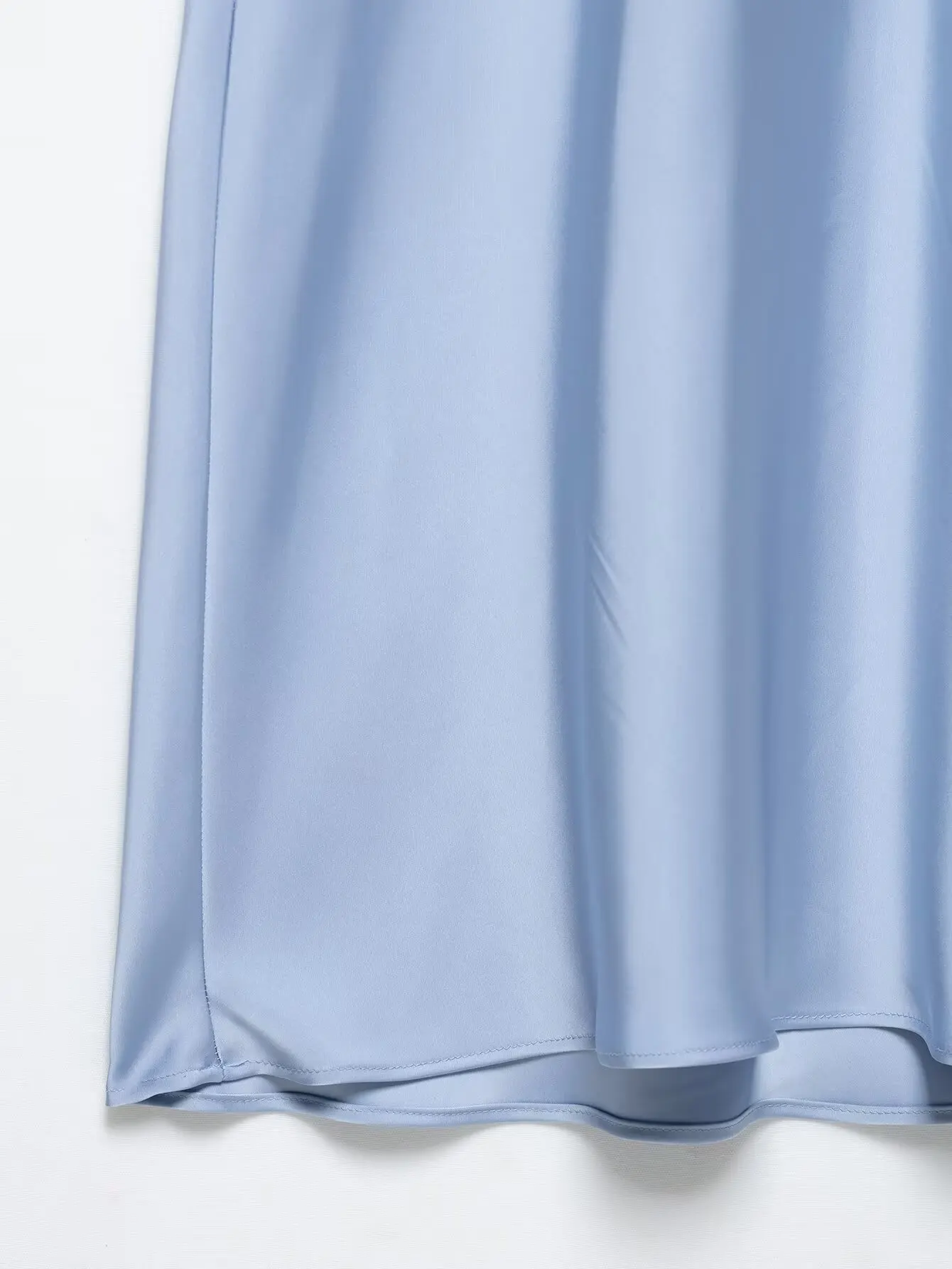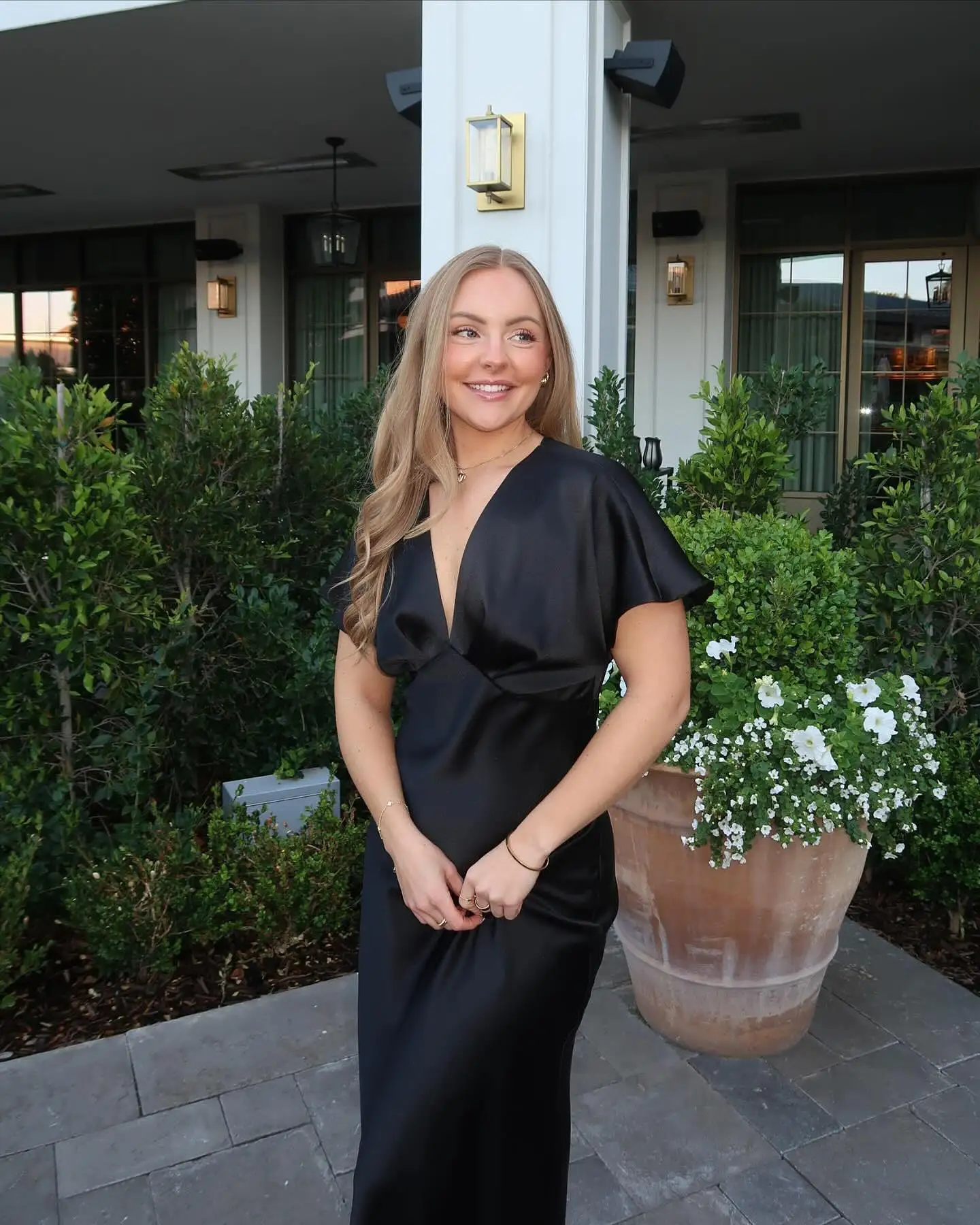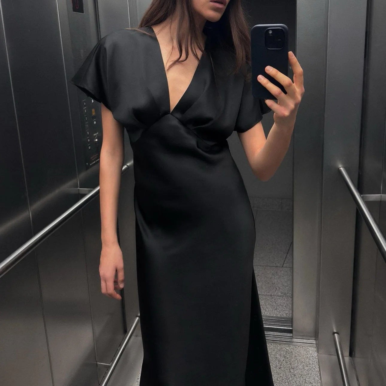 V-neck Flare Sleeve Party Dress Simple All-match Solid Color Satin Long Dress New High Waist Fashion Chic Femme Vestidos