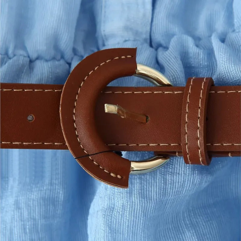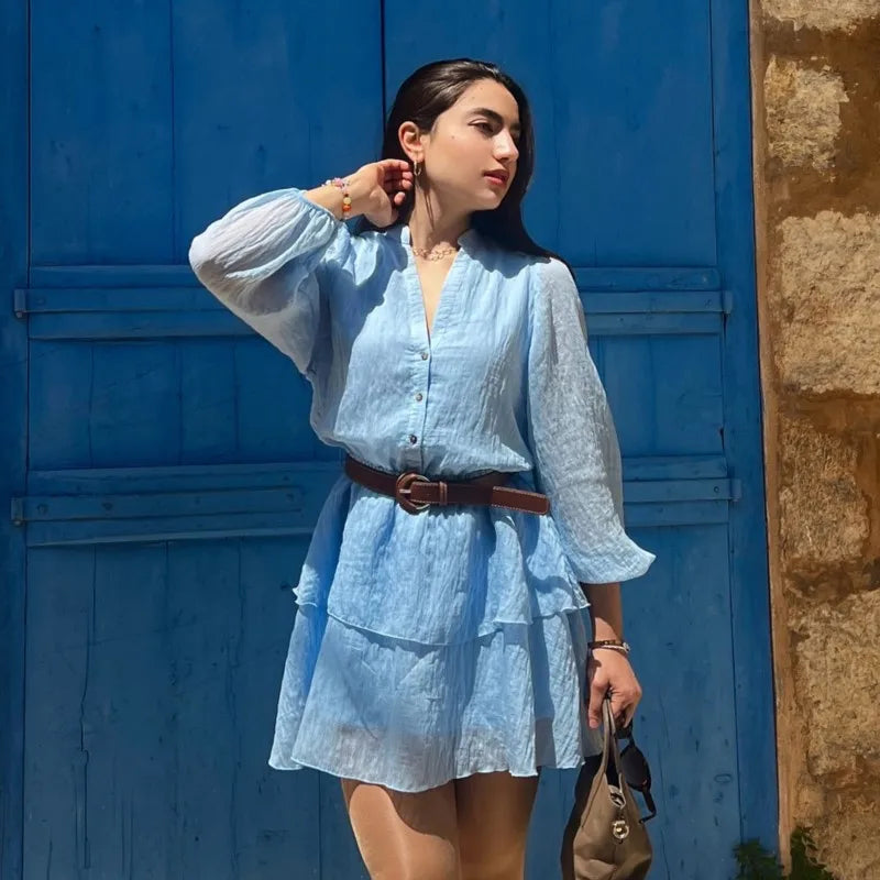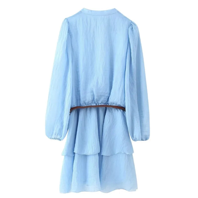 Vacation Blue Short Dress For Summer Lantern Sleeve Casual Solid Color Spring Women Dress With Belt A-line Fashion Vestidos