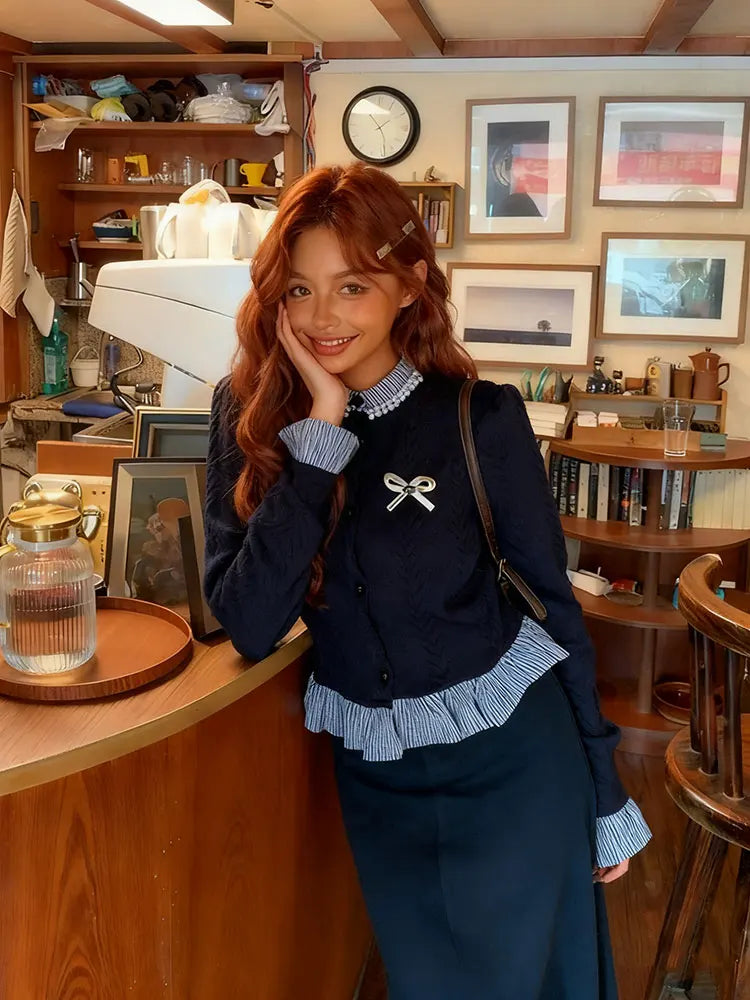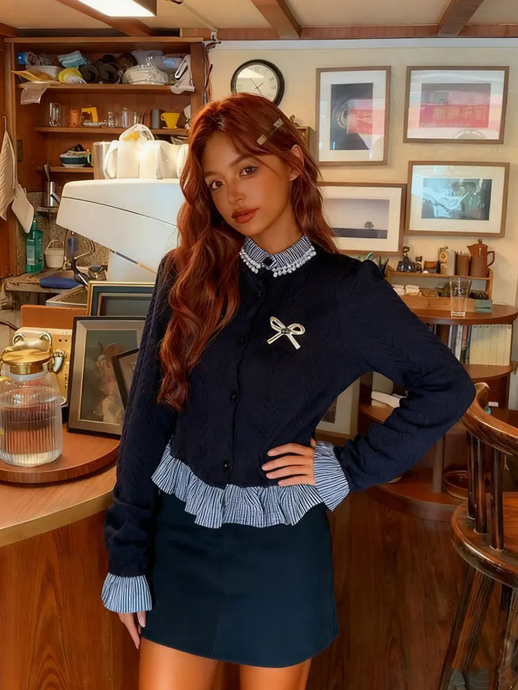 Vintage Beading Collar Cardigan Women False Two-piece Set Knit Plaid Patchwork Basic Button Down Shirt Sweater School Knitwear
