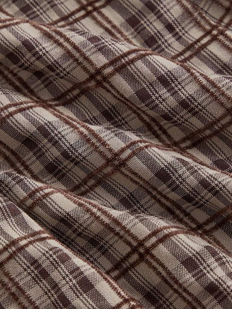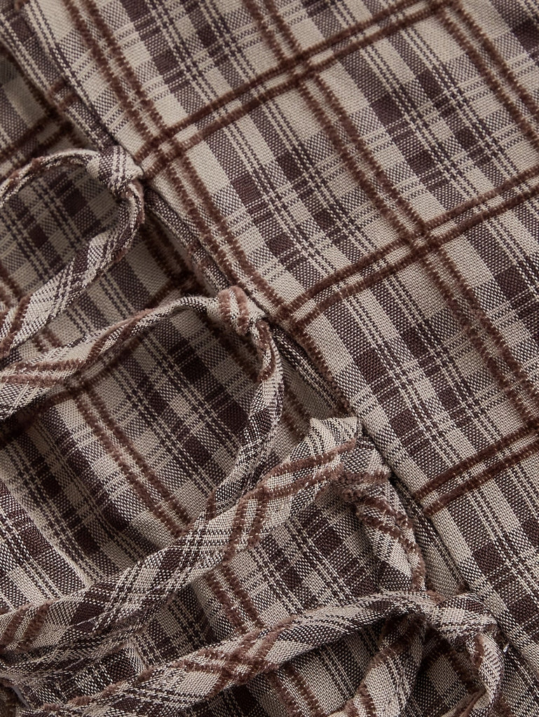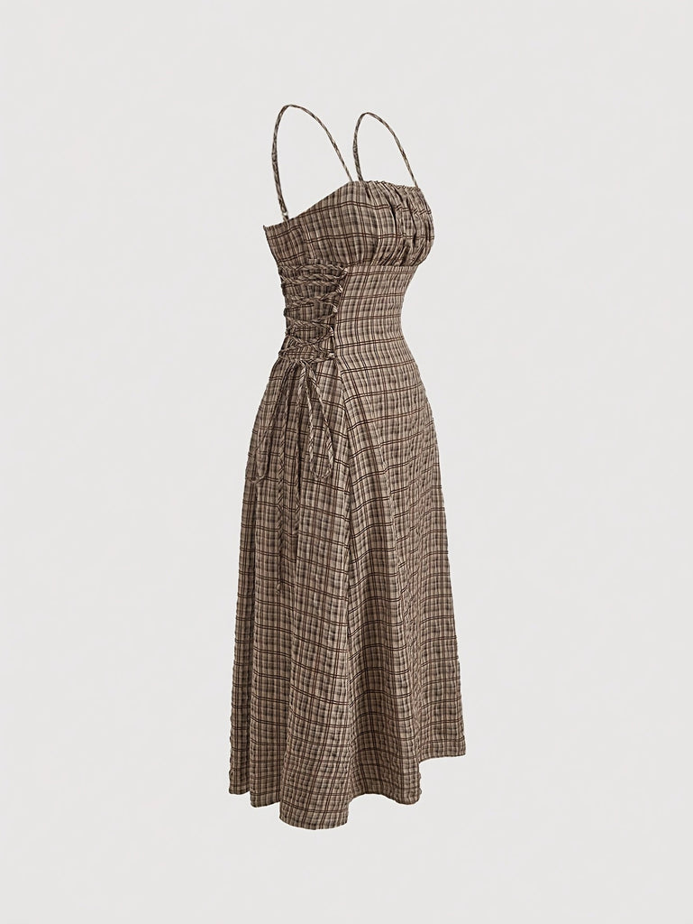 Vintage Beige Plaid Midi Dress for Women with Front Right Side Ruched Tie Detail - Sleeveless, Polyester, Machine Washable - Ideal for Spring/Summer/Fall