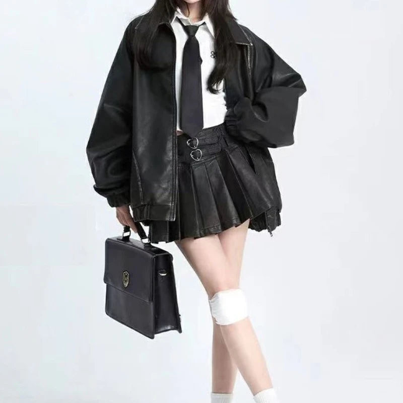 Vintage Brown Leather Skirt Women Y2k Sexy Gothic Pleated Mini Skirt Black Punk Grunge Retro Short Skirts Streetwear
