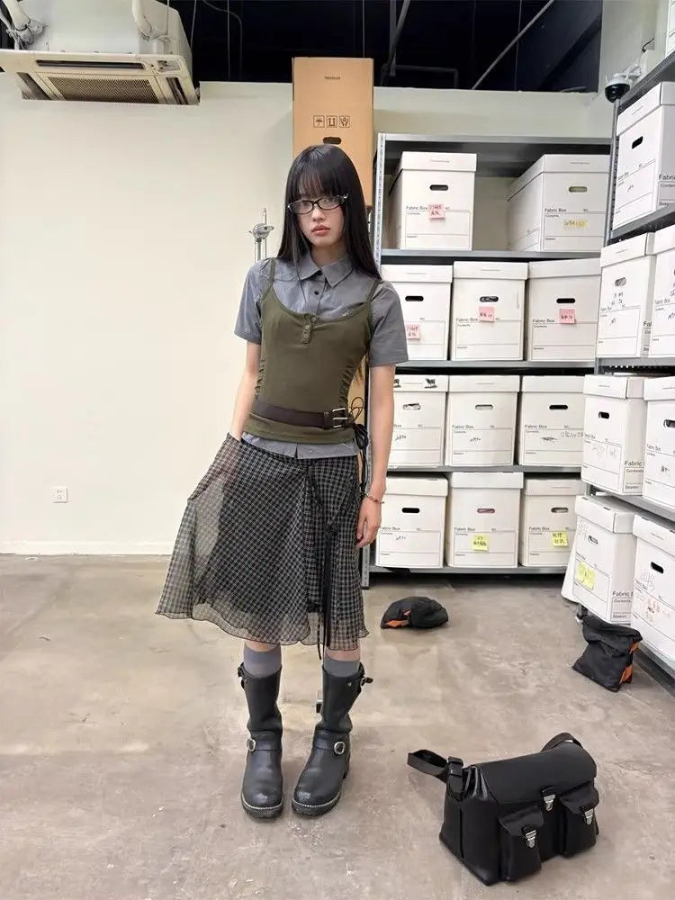 Vintage Plaid Mesh Skirts Women Japanese Asymmetrical Mid Skirt Y2k Harajuku Lace Up Short Skirts Aesthetics Elegant