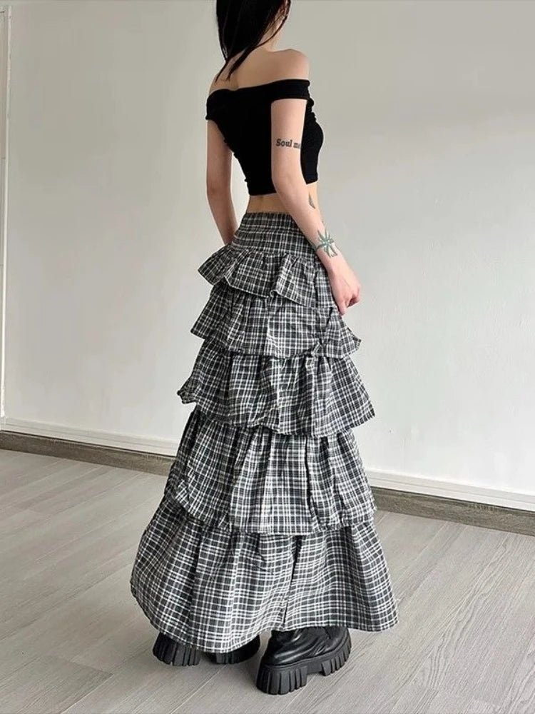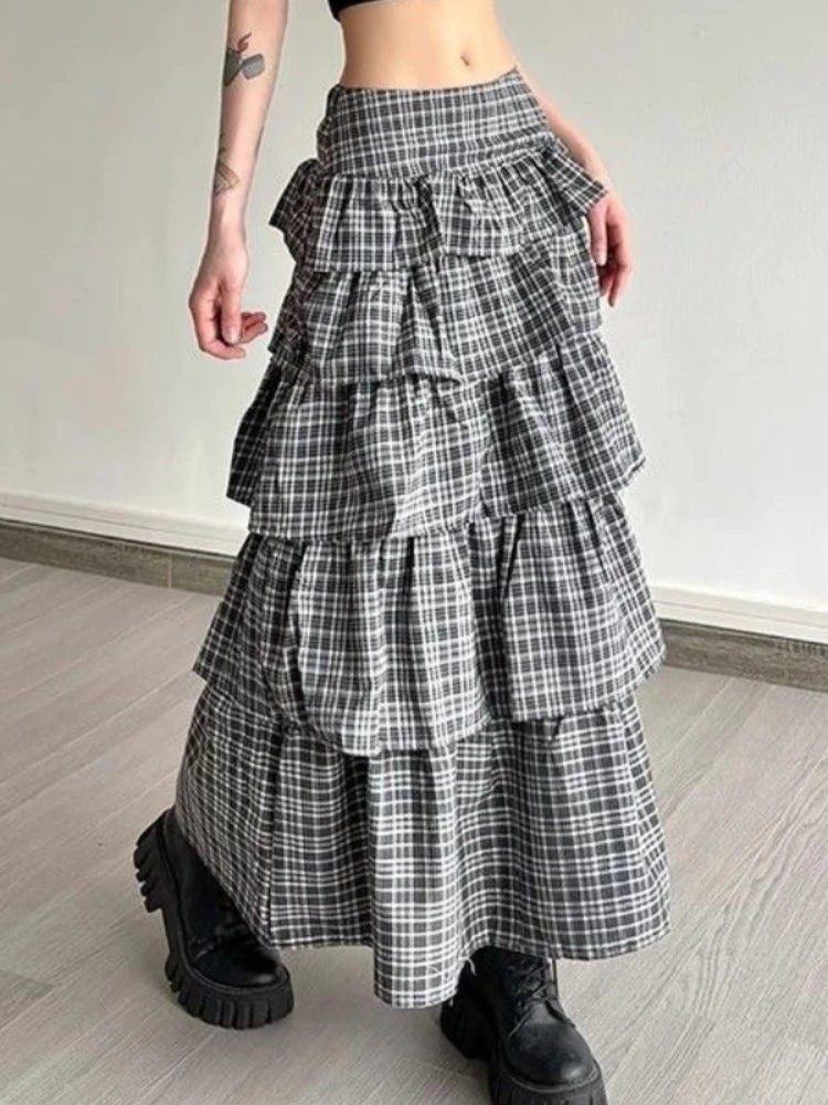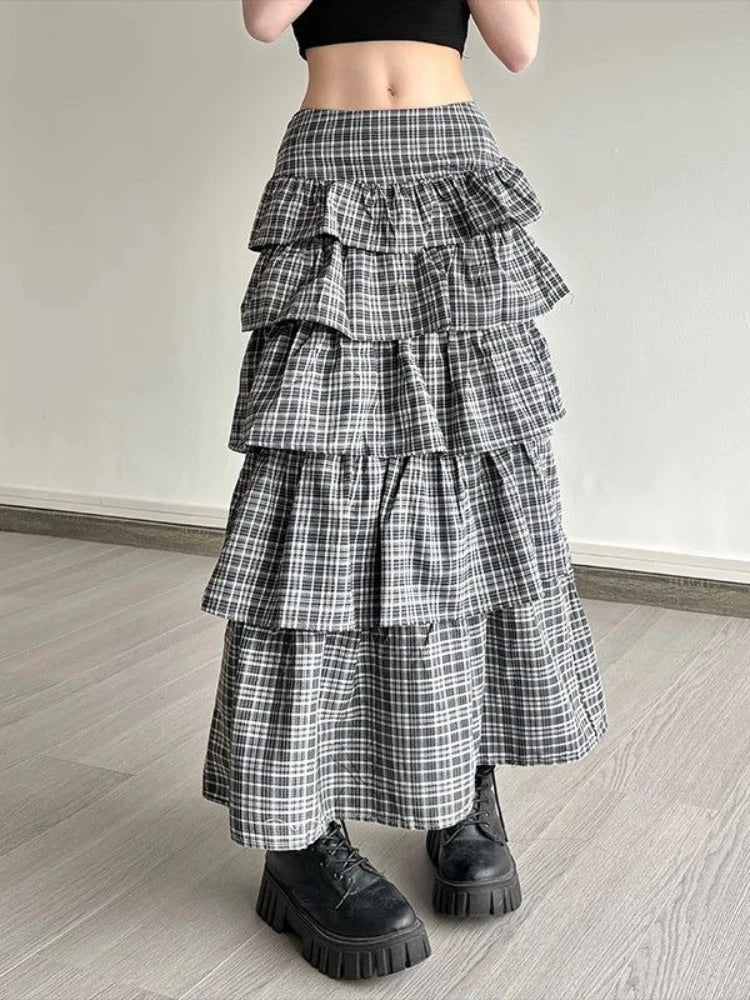 Vintage Plaid Skirt Women Preppy Style Sweet Ruffle Cake Long Skirt Harajuku Fashion Patchwork Layered Skirts Street
