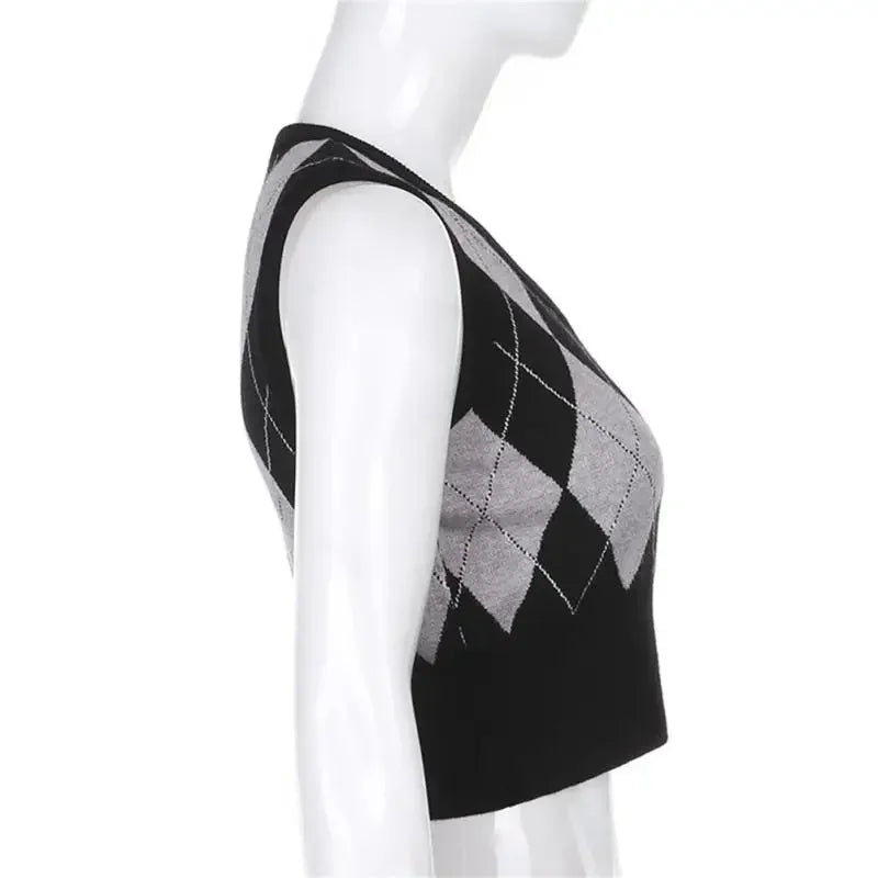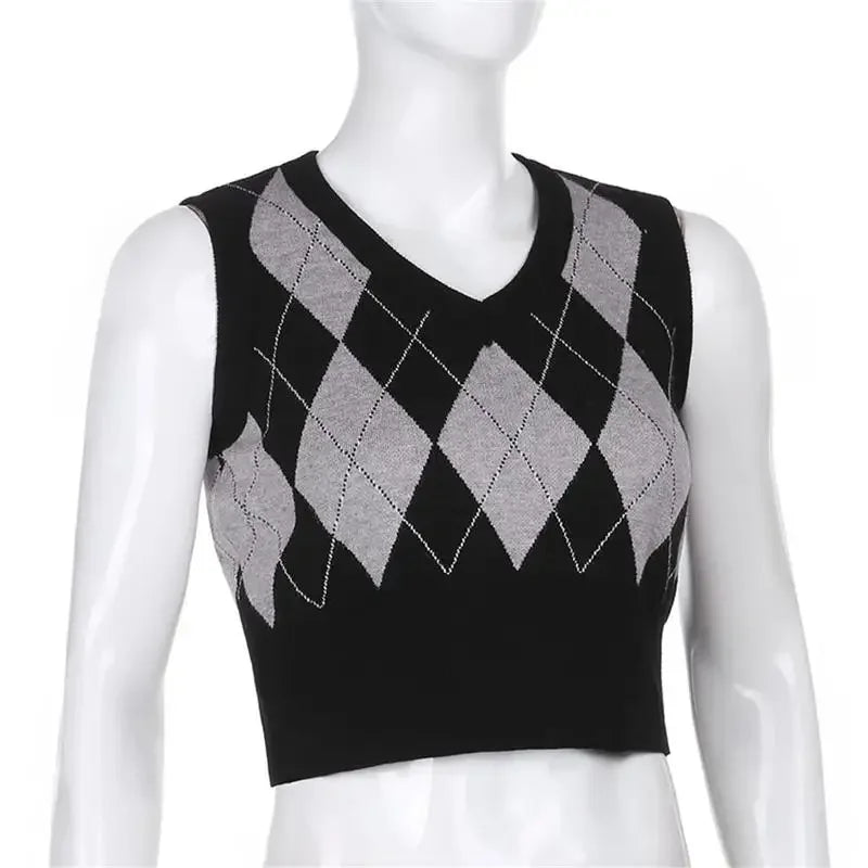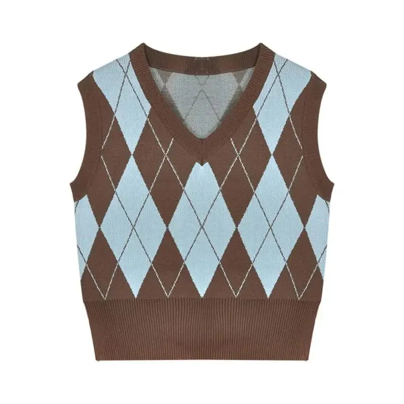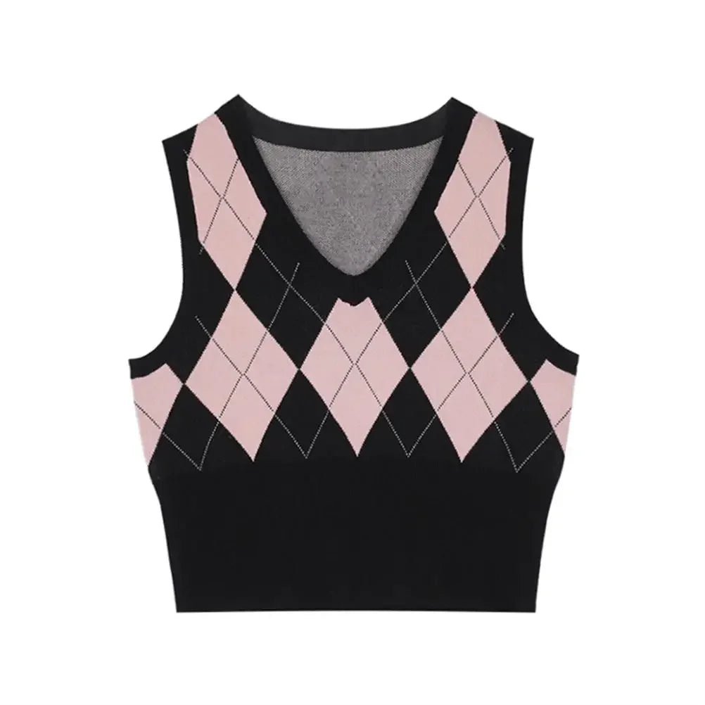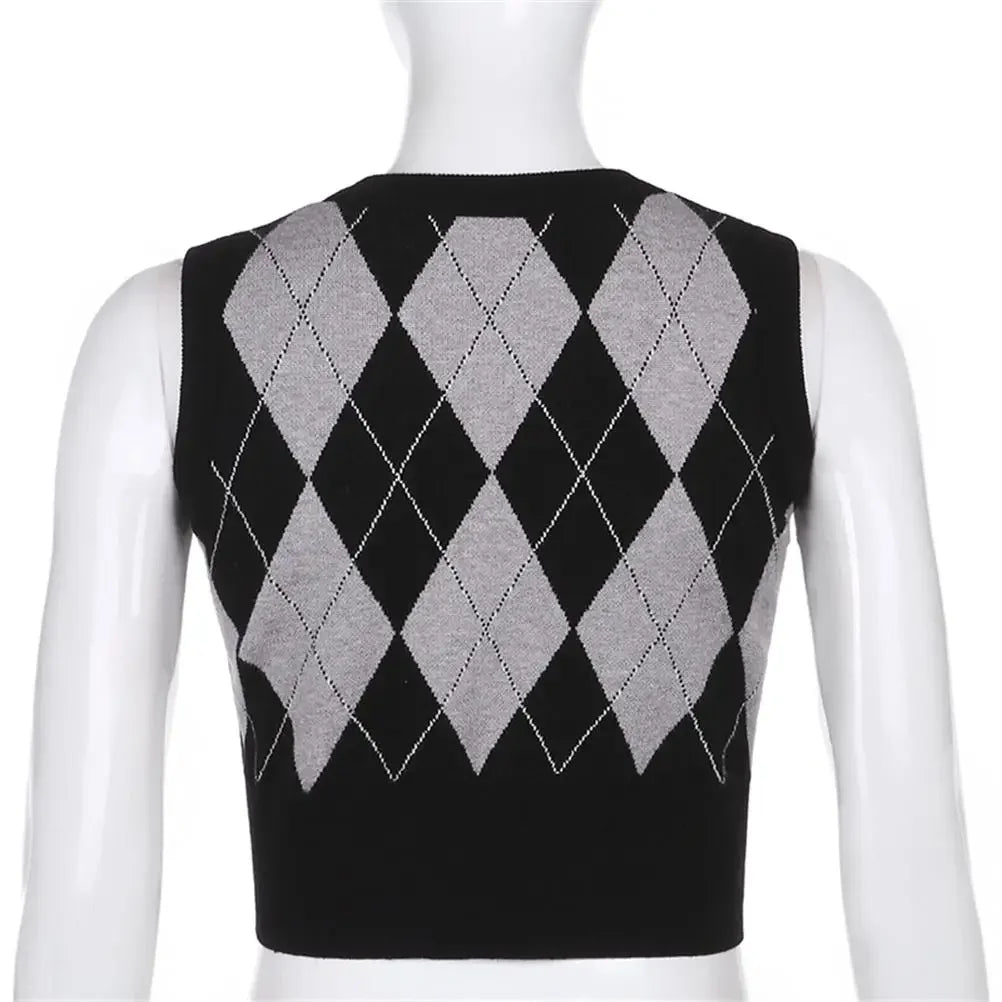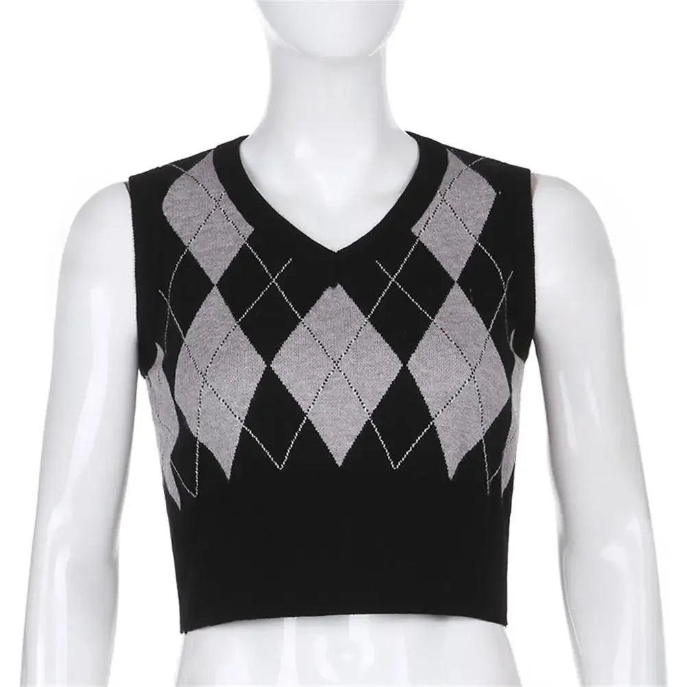 Vintage Plaid Sweater Vest Women V-neck Sleeveless Tank College Style Knitting Pullovers Tops for Daily