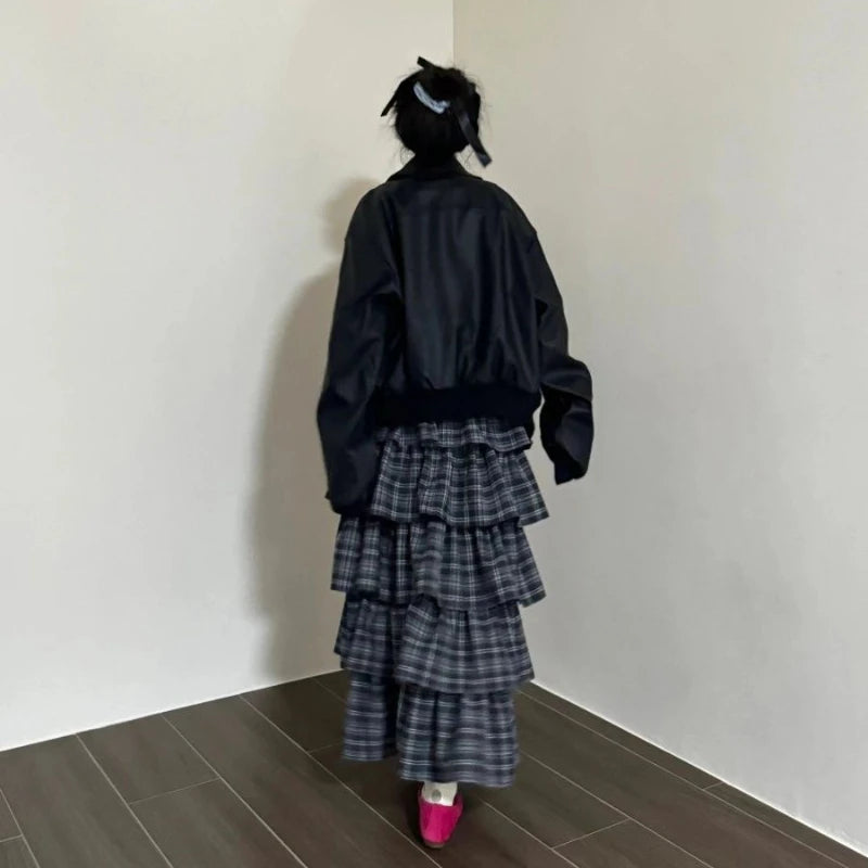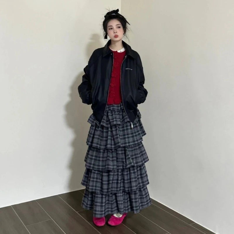 Vintage Ruffle Plaid Skirt Women Elegant Sweet Long Skirts Japanese Style Streetwear Fashion Patchwork Layered Skirt