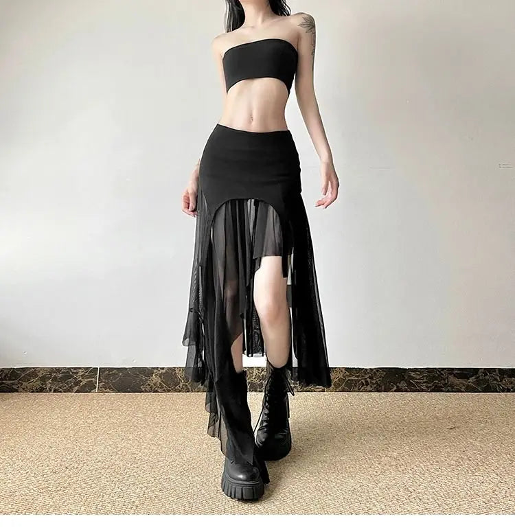 Vintage Sexy Slit Skirt Women Y2k Elegant Irregular Sweet Ruffle Skirts Korean Style Tulle Streetwear Layered Skirts
