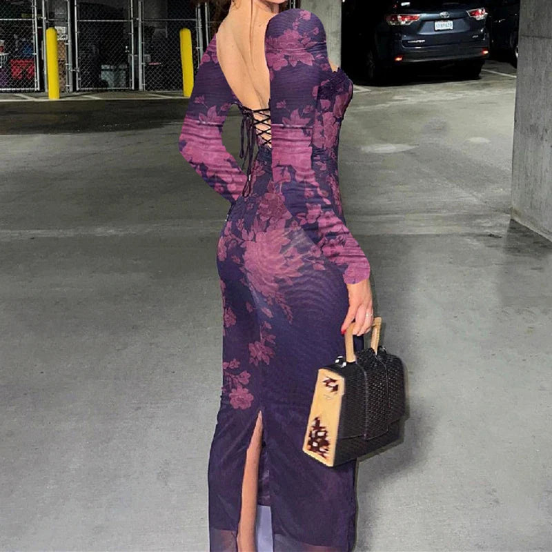 Vintage Square Neck Floral Printed Long Dress