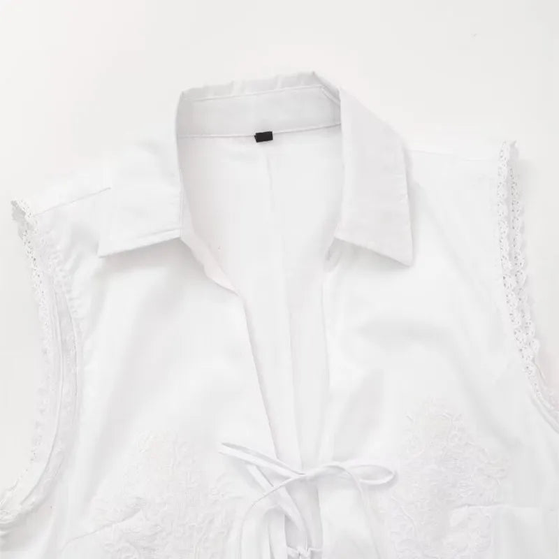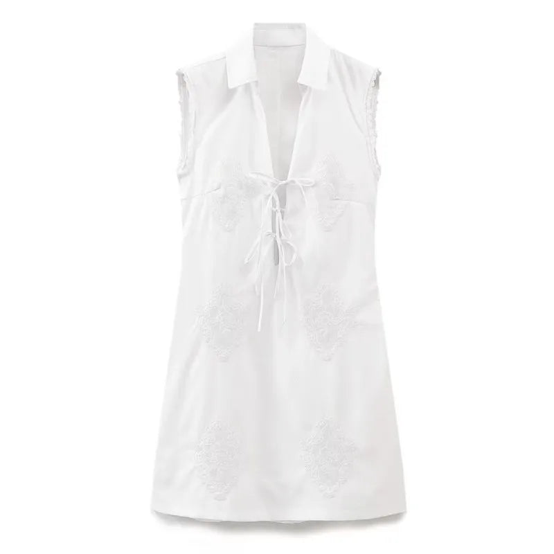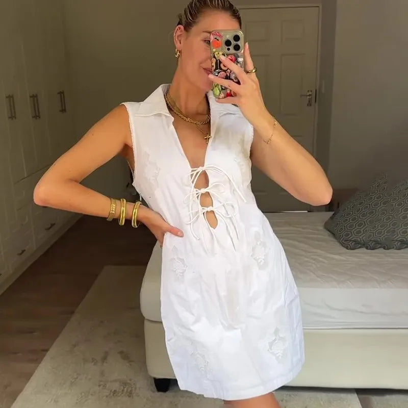 White Embroidery Straight Fashion Short Dress New Hollow Out Lace-ups Sleeveless Women Dress Streetwear Female Clothing