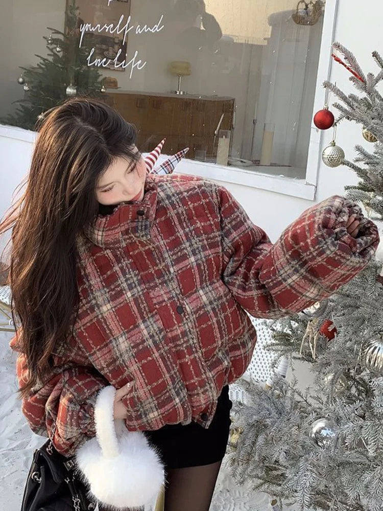 Winter Vintage Warm Plaid Parkas Women Thick Loose Long Sleeve Cute Cotton Coat Casual American Retro Stand Collar Y2K Tops