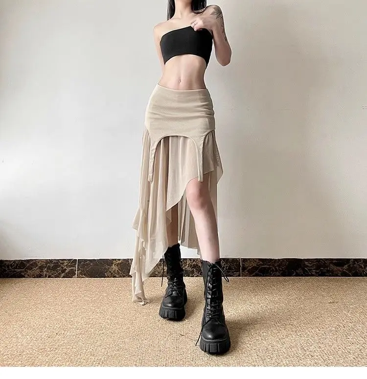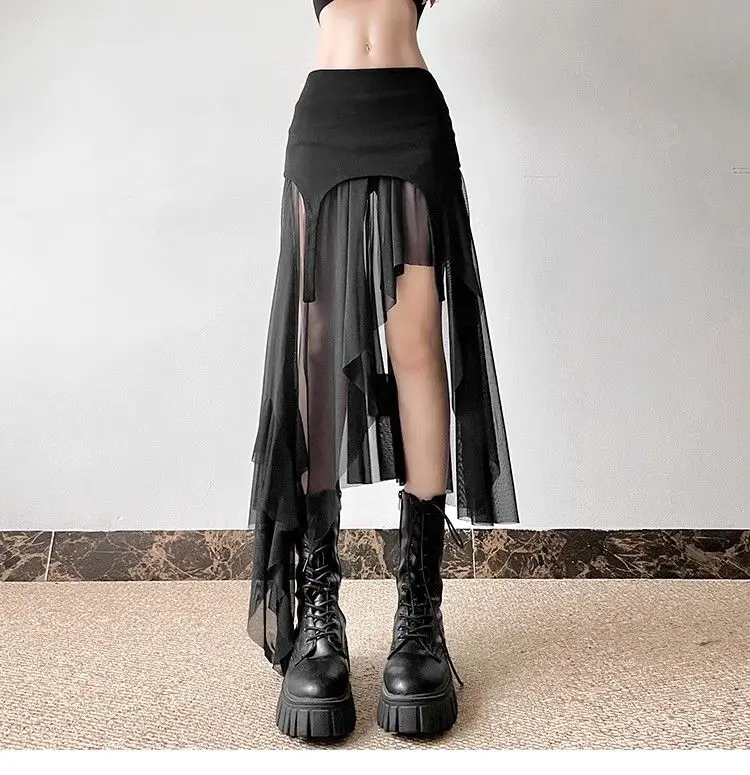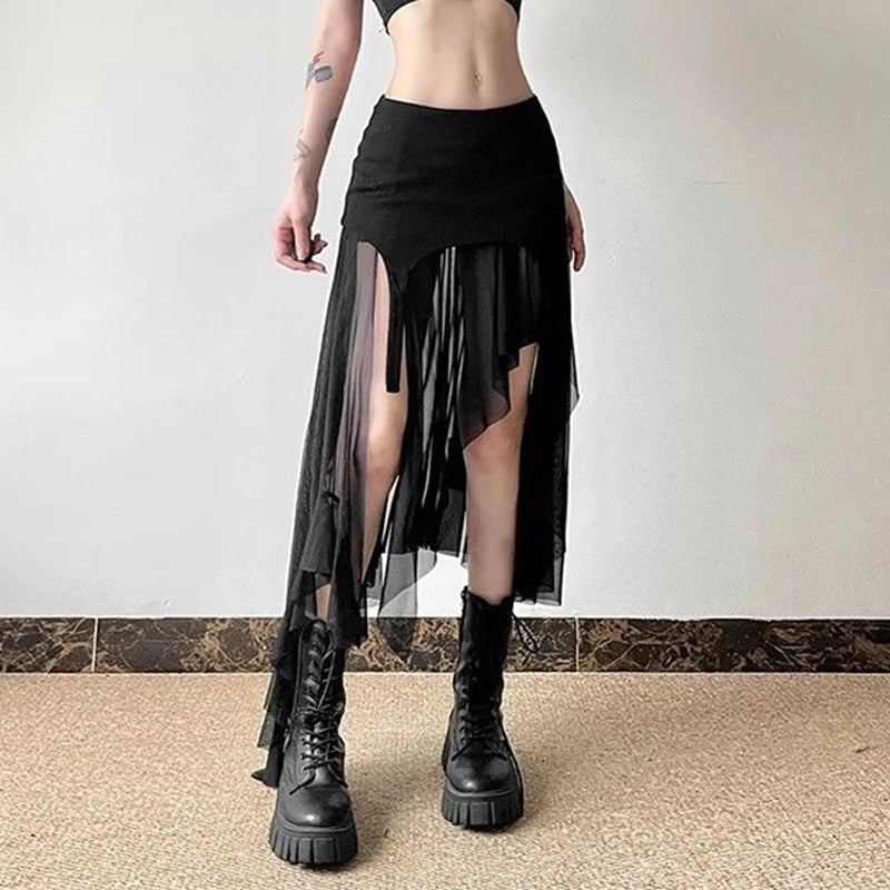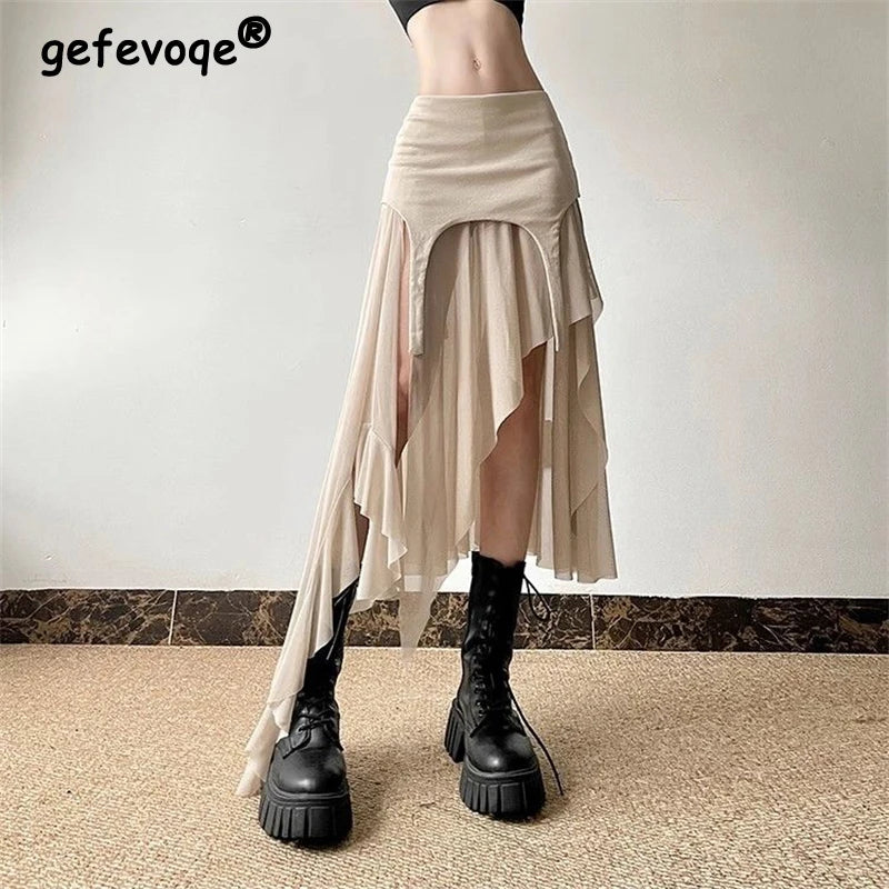 Women Clothes Vintage Y2K Harajuku Aesthetic Fairy Asymmetrical Skirts Summer Female Sexy Split Solid High Waist Slim Midi Skirt