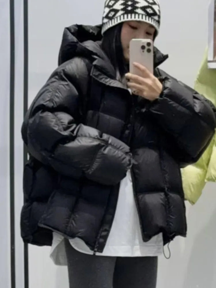 Women Korean-Style Hooded Glossy Cotton Coat Zipper Pocket Long-Sleeve Warm Parka for Autumn Versatile Outerwear Casual New