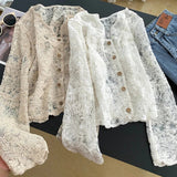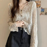 Women Lace Hollow Long Sleeve Shirt Korean Fashion Preppy Style Sweet Blouse Summer Loose All Match Apricot Female Tops