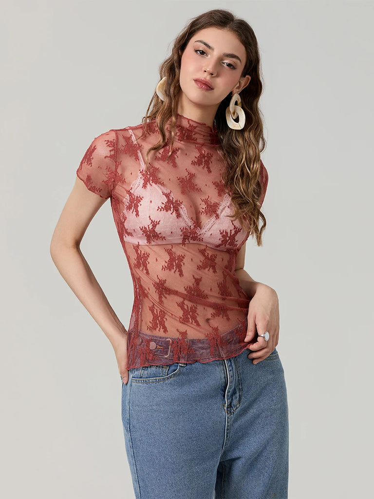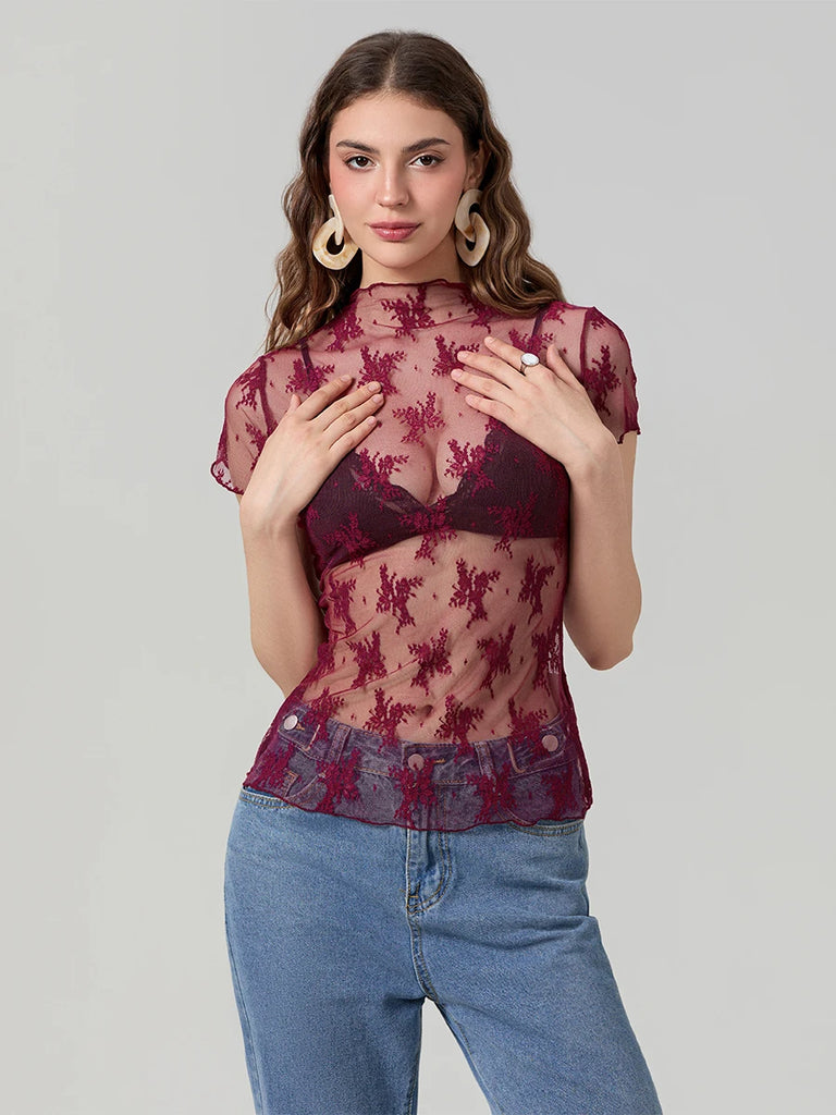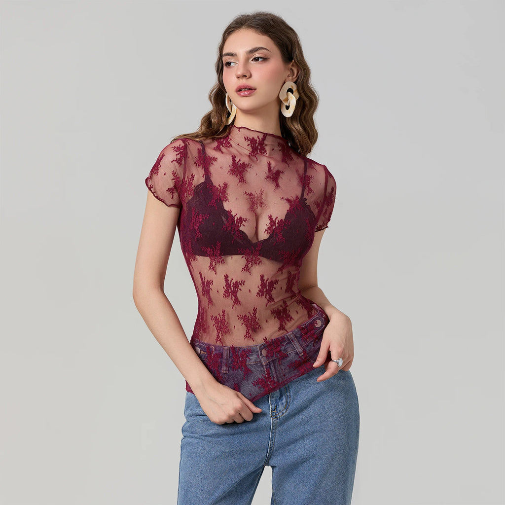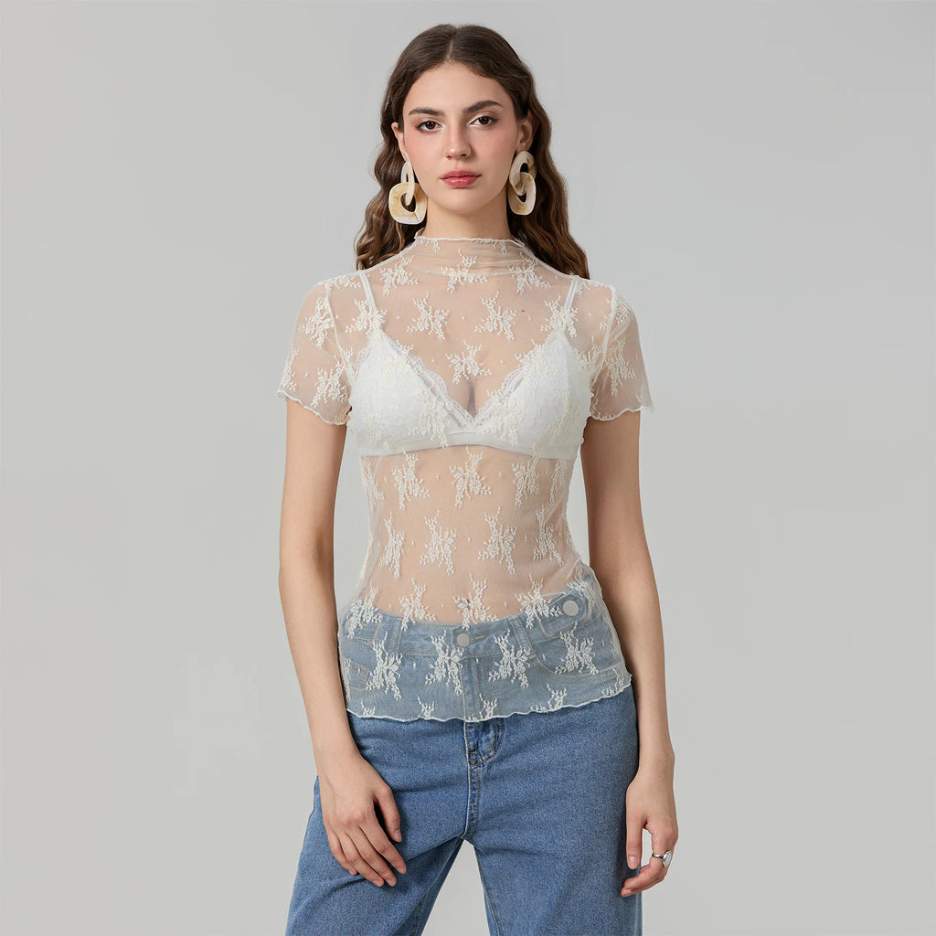 Women Lace Tops Short Sleeve Crew Neck See-through Sheer T-shirt Summer Casual Tee Shirts Clubwear