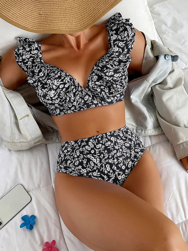 Women New Solid Color Pleated Lace Bikini Two Piece Ruffle Backless Button Up Deep V Swimwear Sexy High Waist Push Up Swimsuit