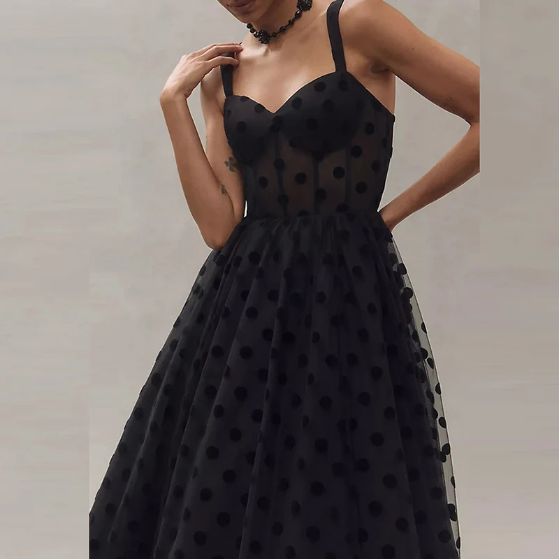 Women Patchwork High Waist Party Dress New Luxury Mesh Suspender Folds A-line Dress Temperament Polka Dot Slim Long Dress