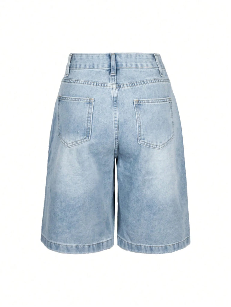 Women Summer Denim Jorts Vintage Cat Whisker Washed Loose Slant Pockets Daily Wear Bermuda Knee-length Shorts