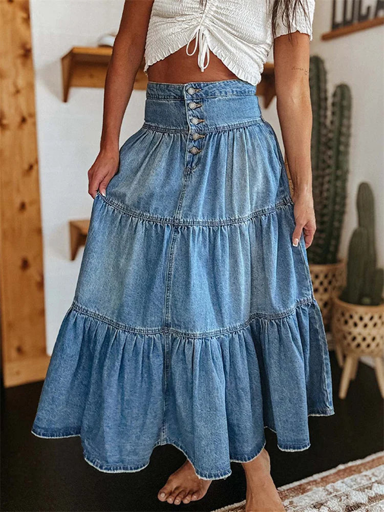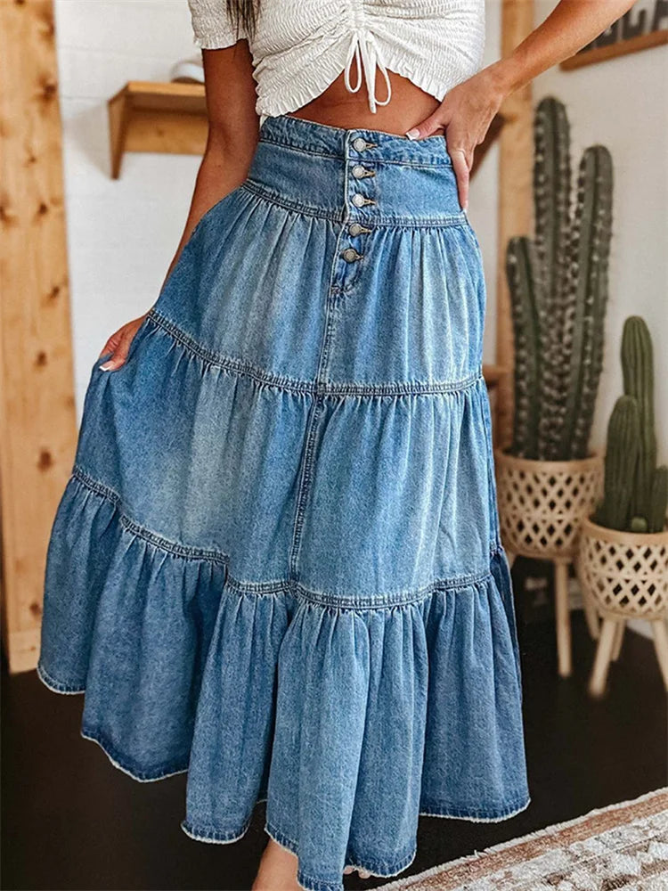 Solid color denim fabric makes you stand out from the crowd; High waist, button placket, ruffled hem, A-line and ankle length design; Casual summer skirts; Cute skirts for women to add a touch of elegance to your outfits