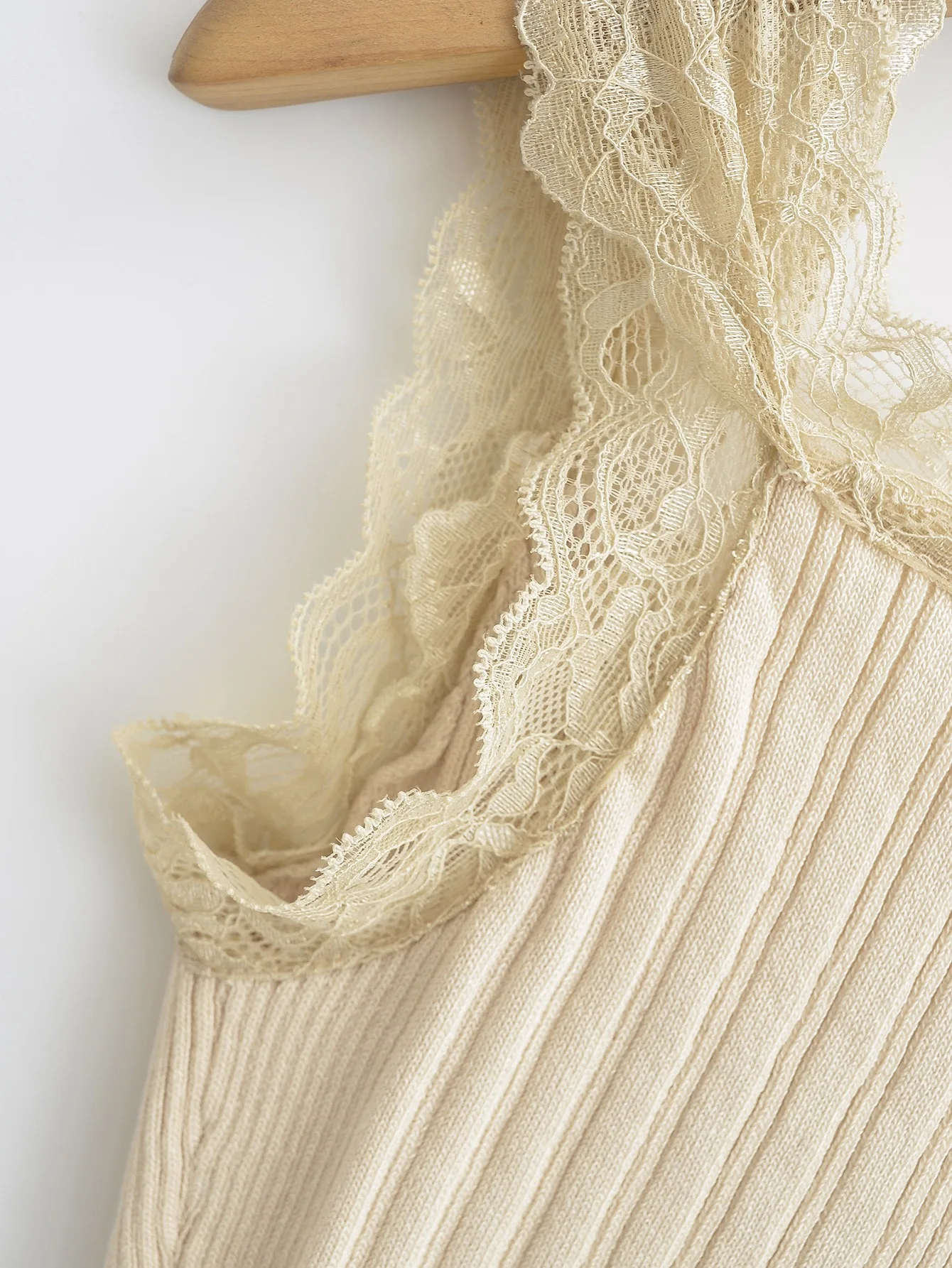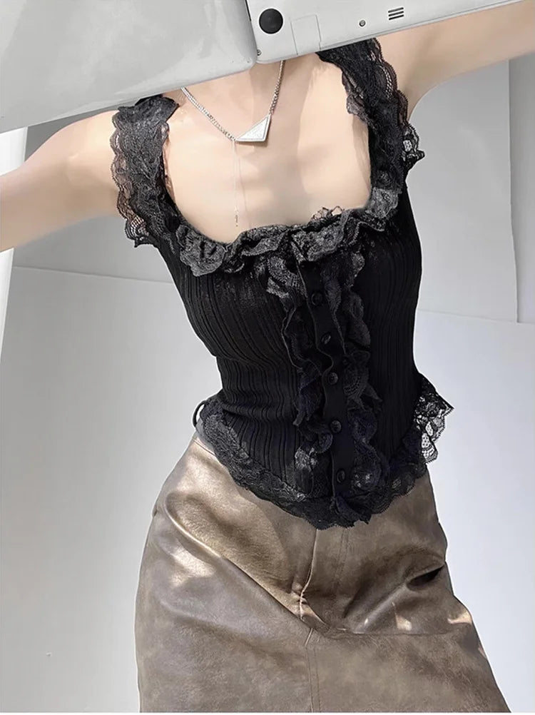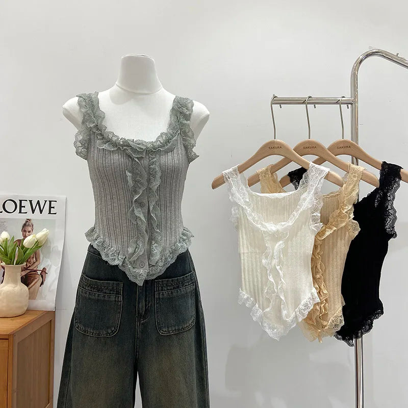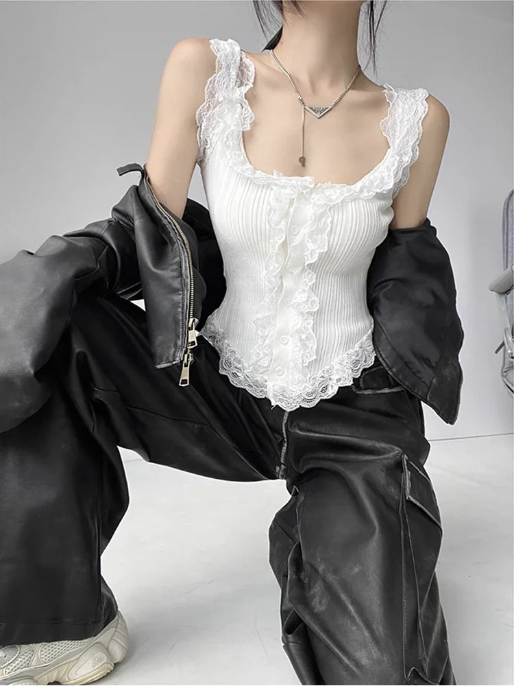 Women's Sweet Girl White Lace Knitted Crop Top Korea U-Neck Spaghetti Straps Tank Top 2025 Summer Female White Lace Stretch Cami
