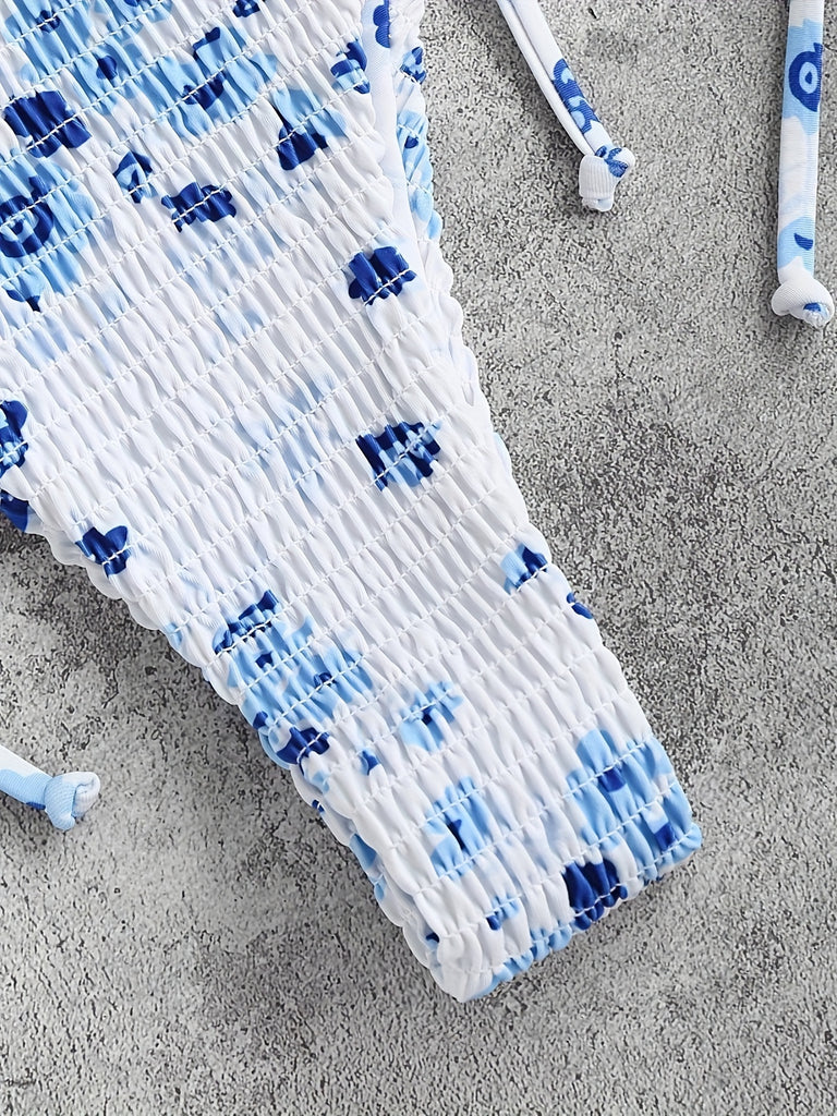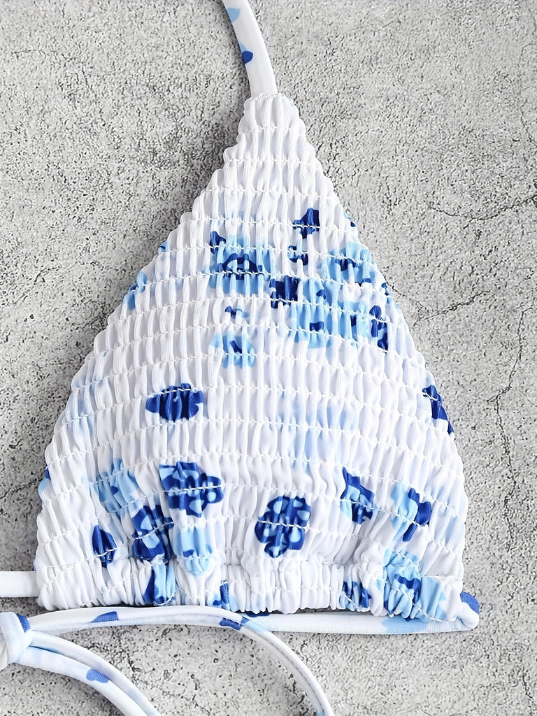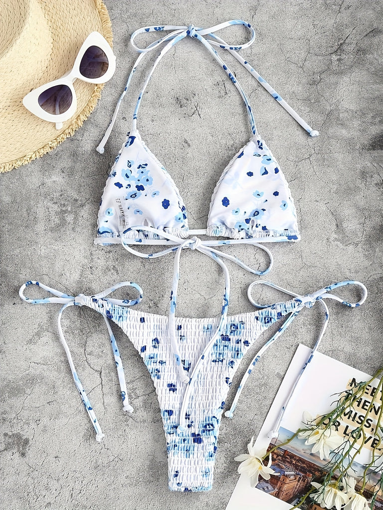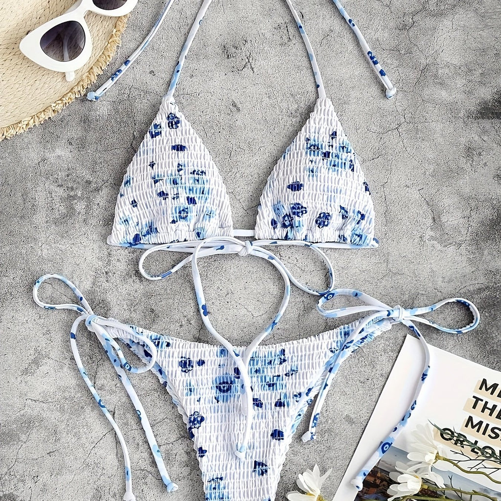 Women'S Tie-Strap Triangle Printed Smocked Bikini Set, Adjustable Beach Swimwear, Floral Print, Summer Essentials