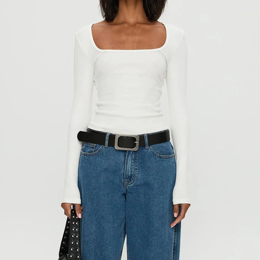y2k Crop Tops Women Sexy Clothing Solid Color Square Neck Long Sleeve T Shirts 2000s Party Clothes Club Streetwear