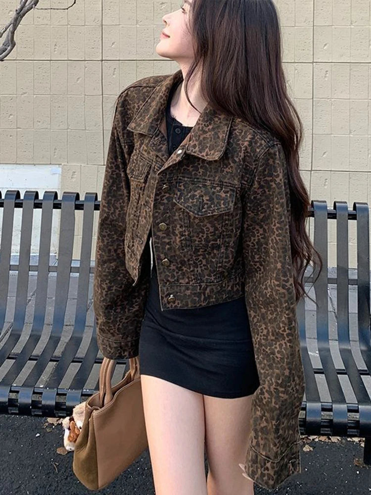 Y2K Cropped Leopard Denim Jacket Women Vintage Streetwear Long Sleeve Slim Short Coat American Harajuku Female Hip Hop Tops