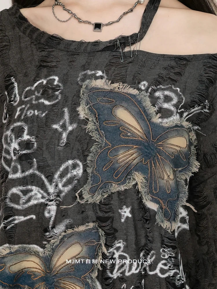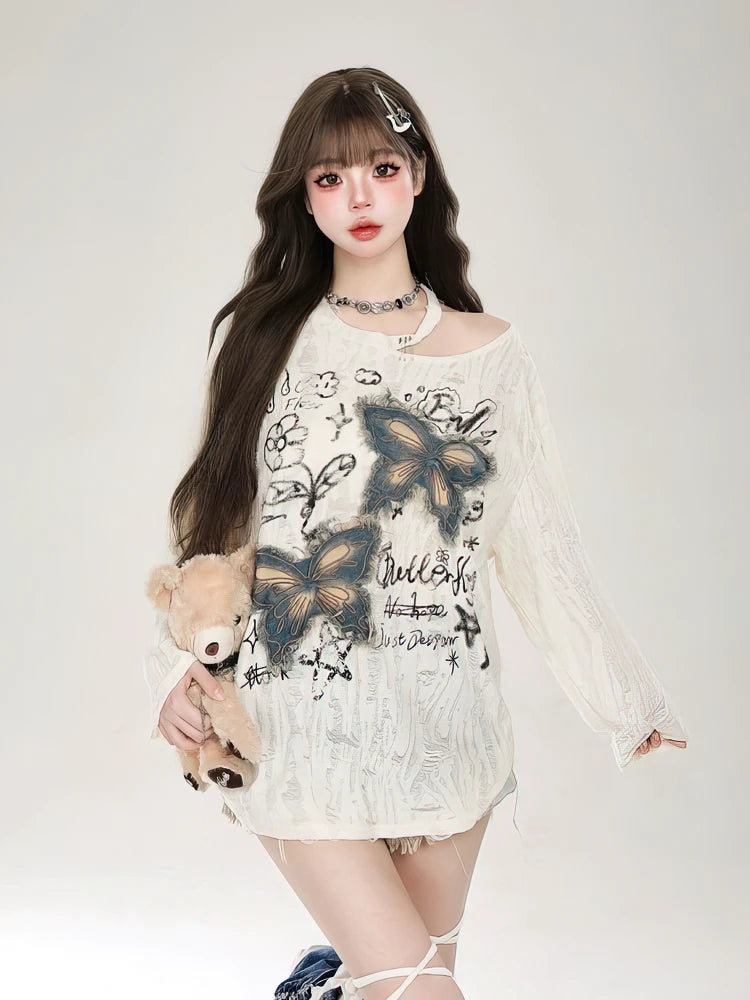 Y2k Holes Graphic Long sleeve T shirt Women Off shoulder Oversize Tops Female Spring Autumn Vintage s Basic Tees Streetwear