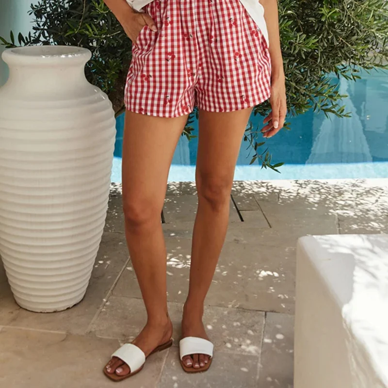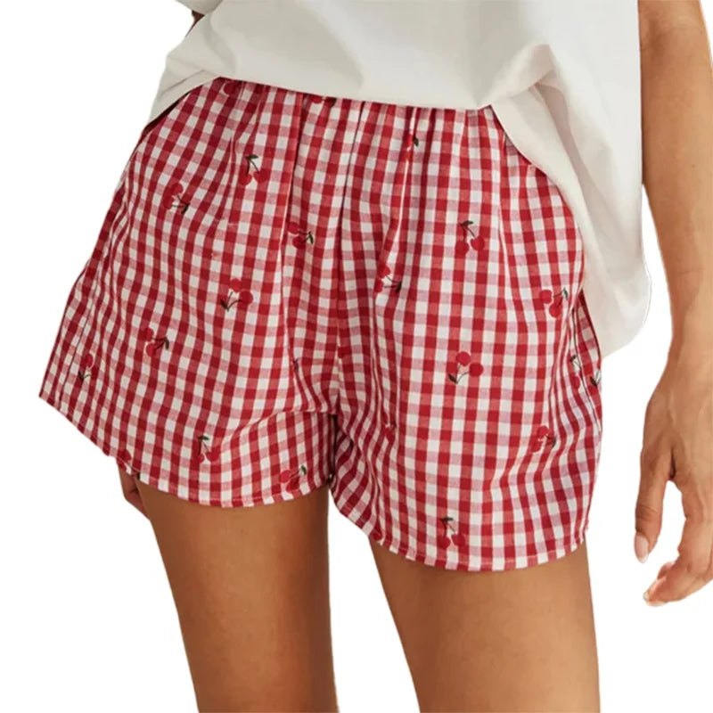 y2k Lounge Shorts Women Summer Cute Cherry Plaid Print Elastic Waistband Pajama Shorts 2000s Clothing Beach Streetwear
