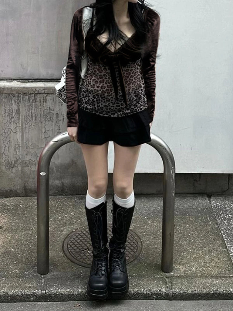 Y2k Retro Leopard Lace Trim V-Neck Blouses Women Velvet Long Sleeve Chic T-Shirt Trendy Clothes Autumn New