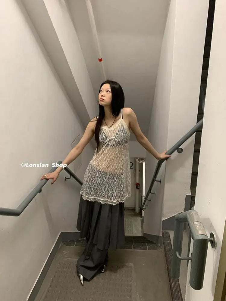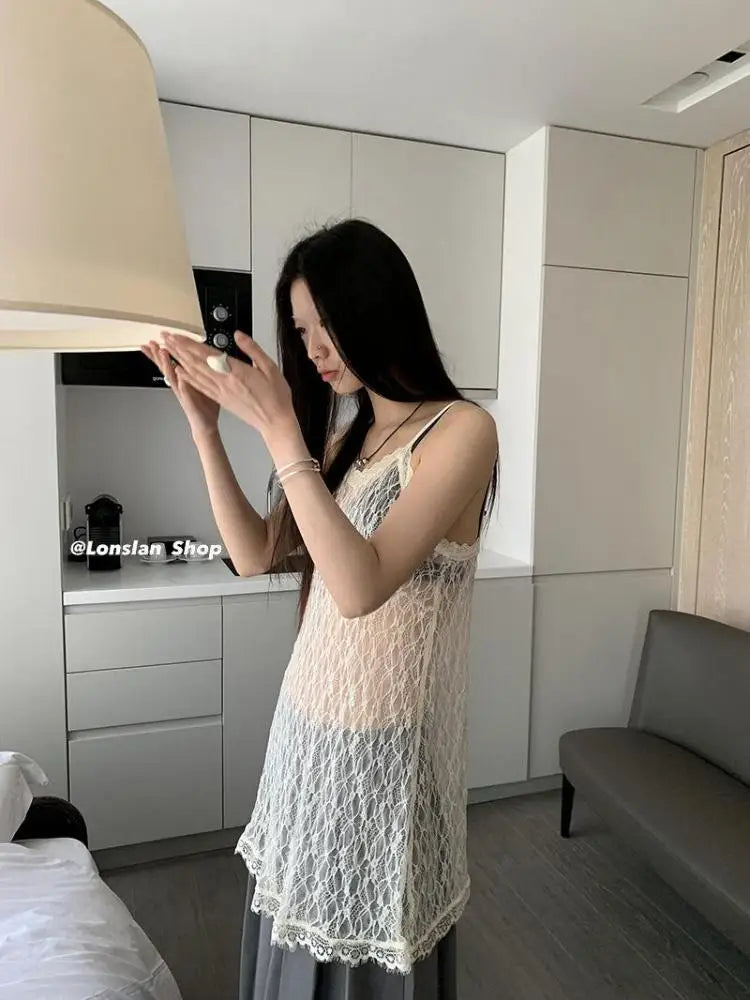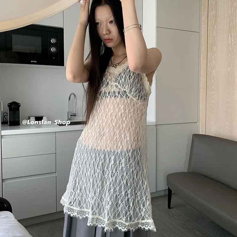 Apricot See Through Halter Tops Women Long Lace Camis Sleeveless Tank Top Japan Style Sweat Sexy Y2k Sheer Backless Tops